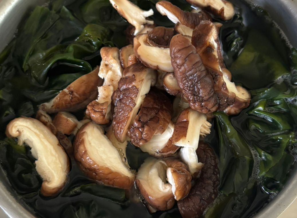 - 냄비에 불린 미역을 넣고 물을 자작하게 부은 다음 끓여준다. 끓어오르면 물을 추가해 주고 불린 표고버섯도 넣고 함께 끓여준다. 진국이 되도록 푹 끓여줌.