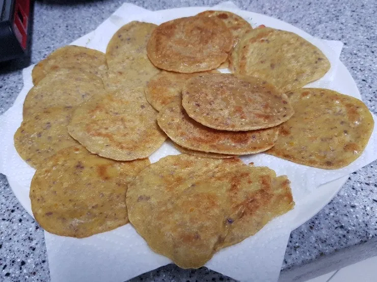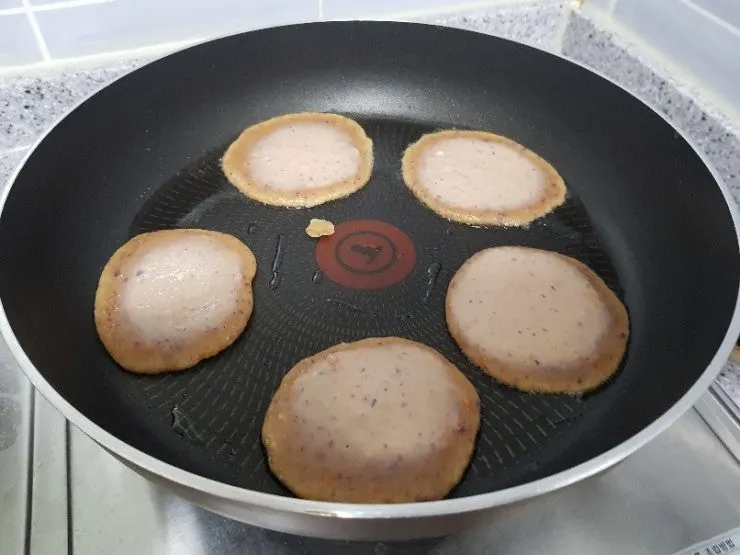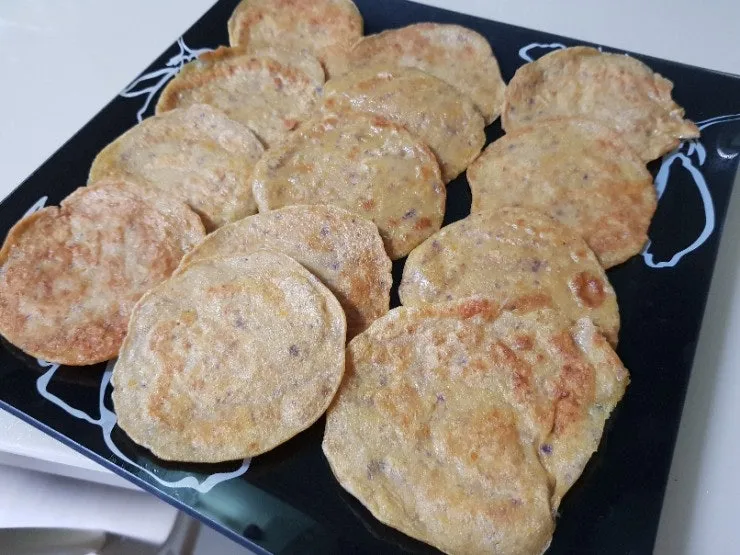 핵심은 모든 재료를 믹서기에 갈아 주는 것. 잘 섞어진 채소반죽을 잘 달궈진 팬에 한 국자씩 떠서 구워 준다.