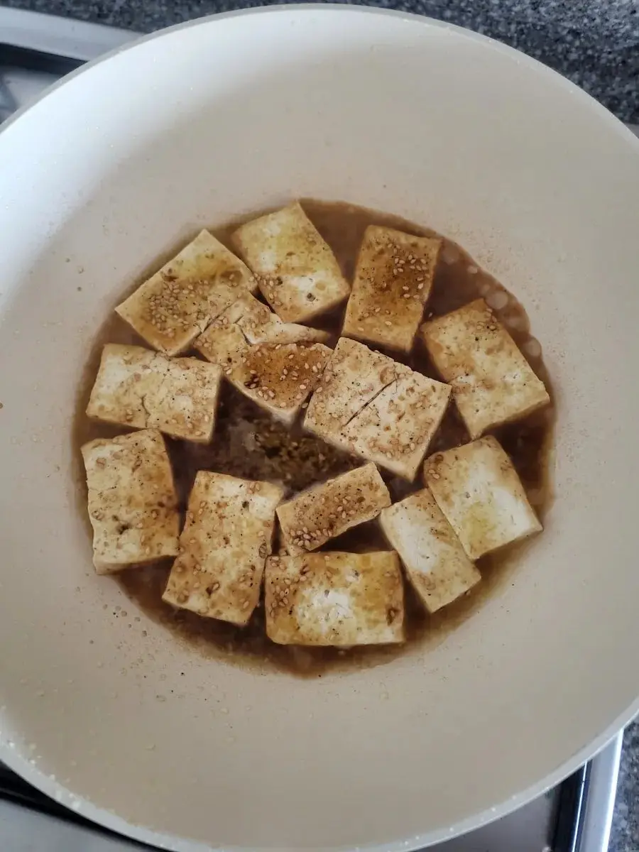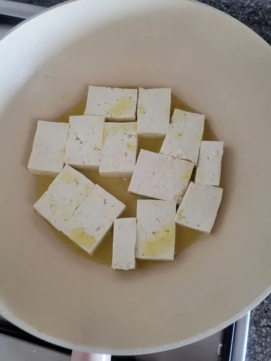 - 팬에 기름 두르고 두부를 올려 앞뒤로 노릇하게 구워준다.