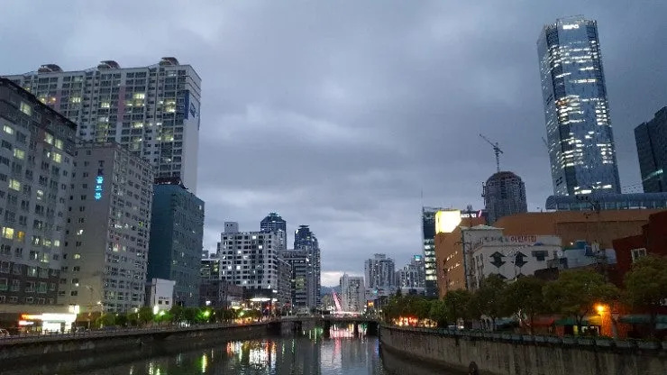 <흐린 하늘과 가로등불빛 건물>