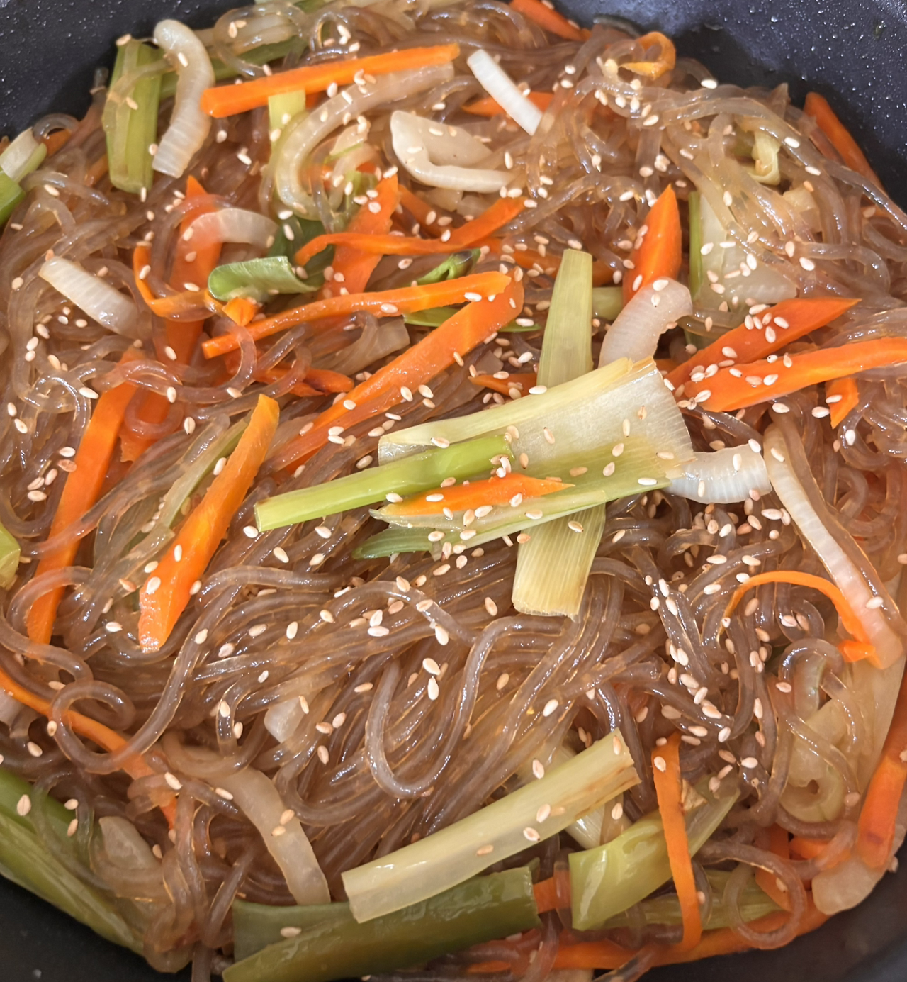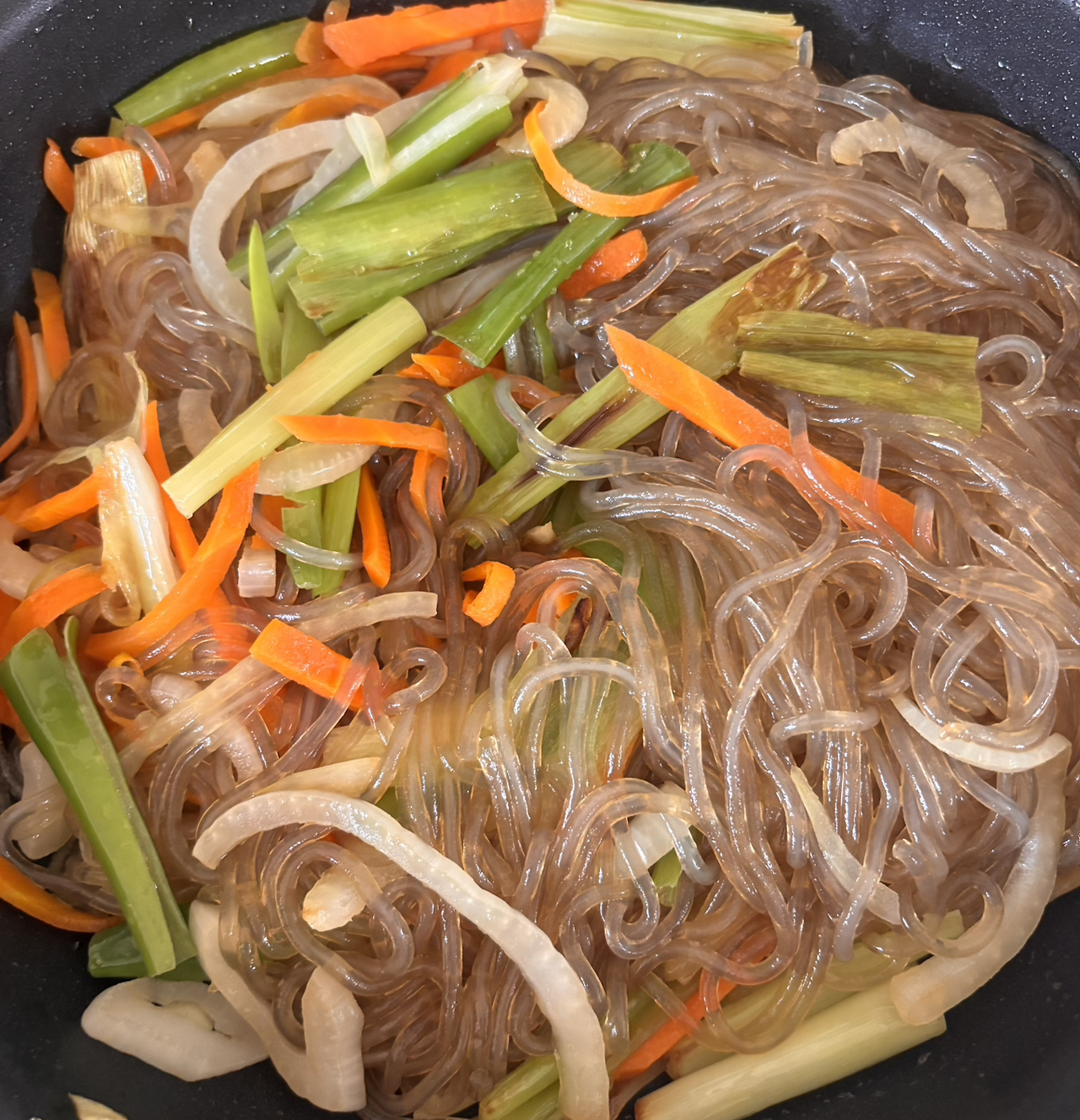- 간장 양념해 둔 잡채를 익혀 둔 채소와 합채 해서 같이 볶아준다.