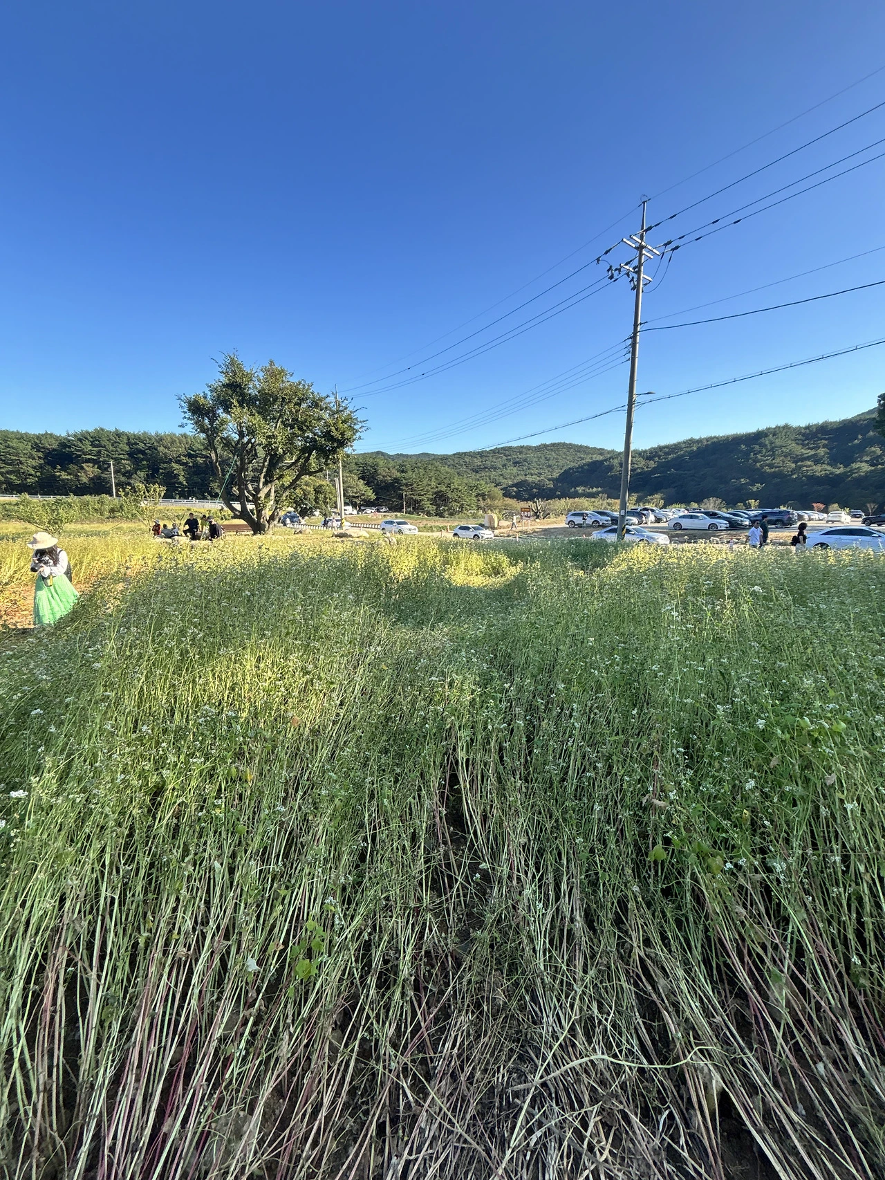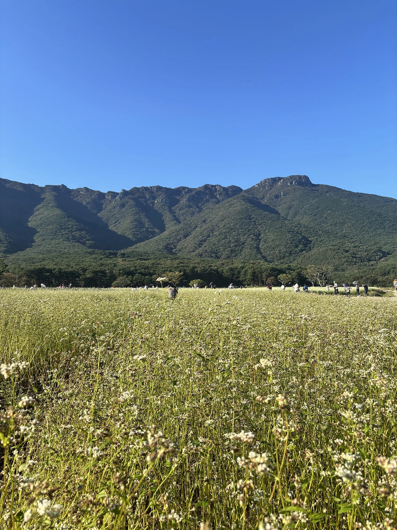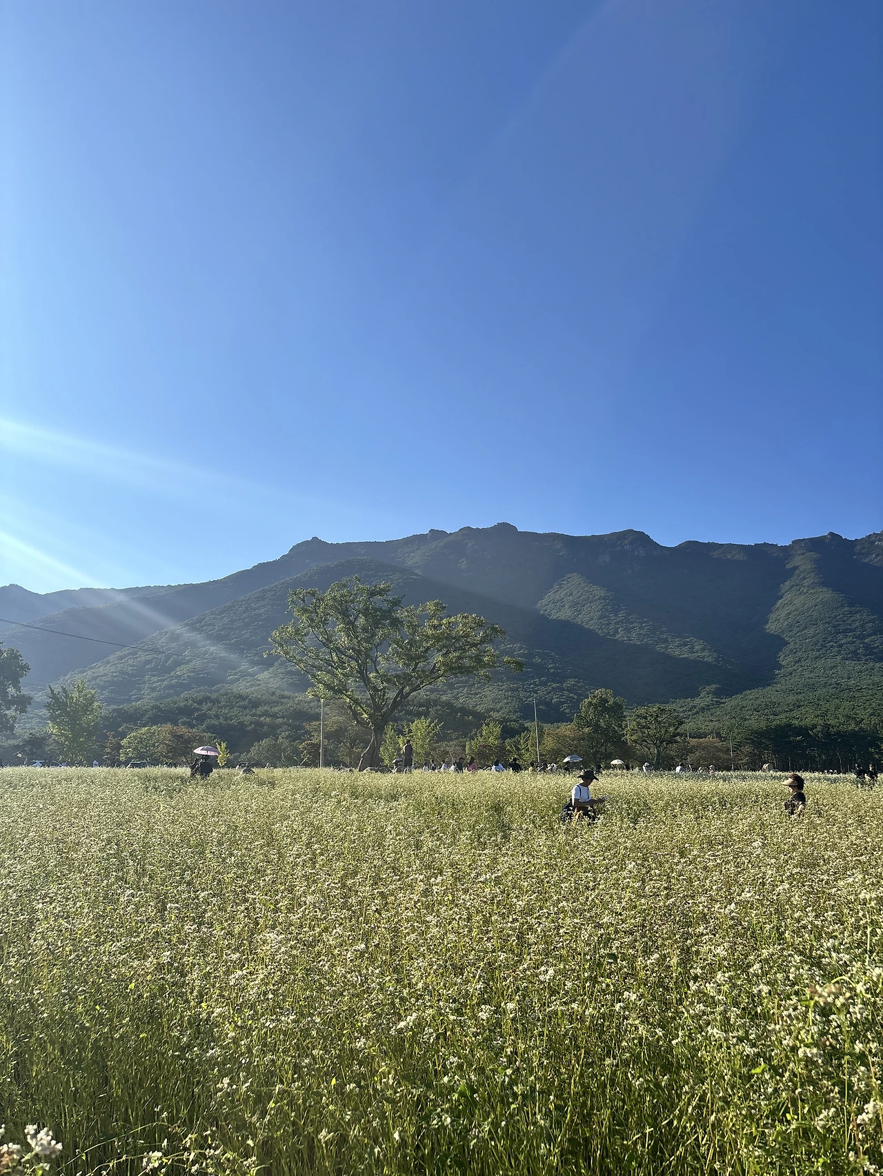 우리도 사람들 틈바구니에 한자리를 잡고 메밀꽃과 산을 배경으로 몇 컷의 사진을 찍었다. 그러곤 셀프로 수십 장의 사진도 찍어보았다. 오롯이 메밀꽃과 하나가 되어 즐거운 한때를 보냈다.