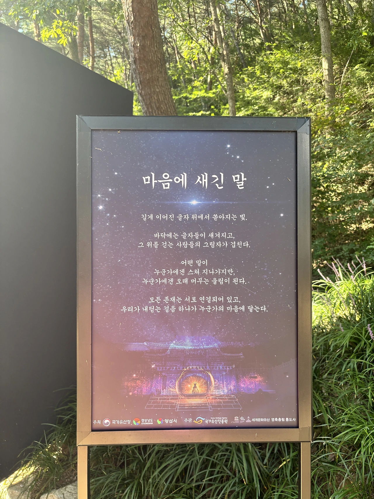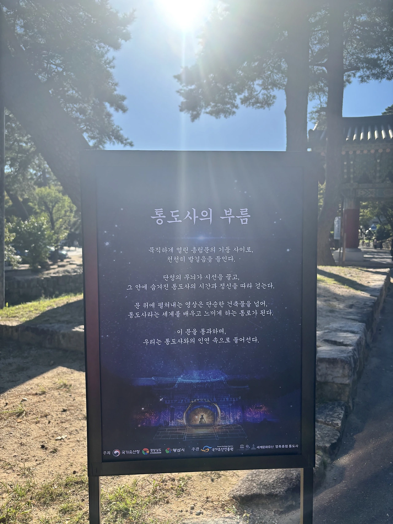 통도사를 방문한 목적은 메밀꽃밭을 보러 가기 위함이었다. 시간이 주어지고 어디를 갈까 했을 때 평소에 생각해 두었던 곳으로 정한 것이다. 산문의 빛이라는 작품 전시회가 함께 열려 그것도 감상하며 통도사를 온전히 누렸다.
