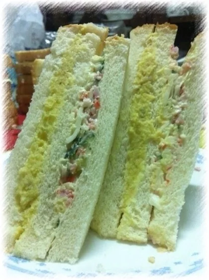먼저 샌드위치다. 각종 야채를 잘게 썰어 준비하는데(볶음밥에 들어갈 재료처럼) 여기엔 오이, 게맛살, 양파 등이 들어간다. 마요네즈로 잘 섞어 둔다. 한쪽은 치즈와 햄을 넣는다. (오랜 시일이 흘러 안타깝게도 정확한 레시피가 생각 안 남)