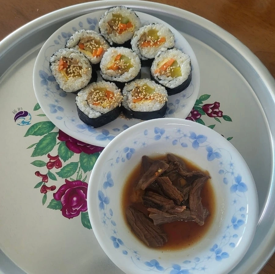 김에 밥을 넉넉히 깔고 계란, 당근, 유부, 어묵, 단무지를 차례대로 올려 잘 말아준다. 김밥이 제법 통통하고 크다. 장조림 김밥은 소고기 장조림의 고기들을 얇게 찢고 조림 국물을 담아내어 여기다가 찍어먹는 김밥이다. 김밥 몇 줄은 실제로 소고기를 넣어 싼다. 또 생각나는 게 계란김밥이다. 계란을 얇게 부쳐 펴고 똑같은 재료들을 넣어 몇 줄 싼다. 이 김밥도 정말 별미다. 소풍 때에만 몇 개 맛을 볼 수 있는 귀한 김밥이다.