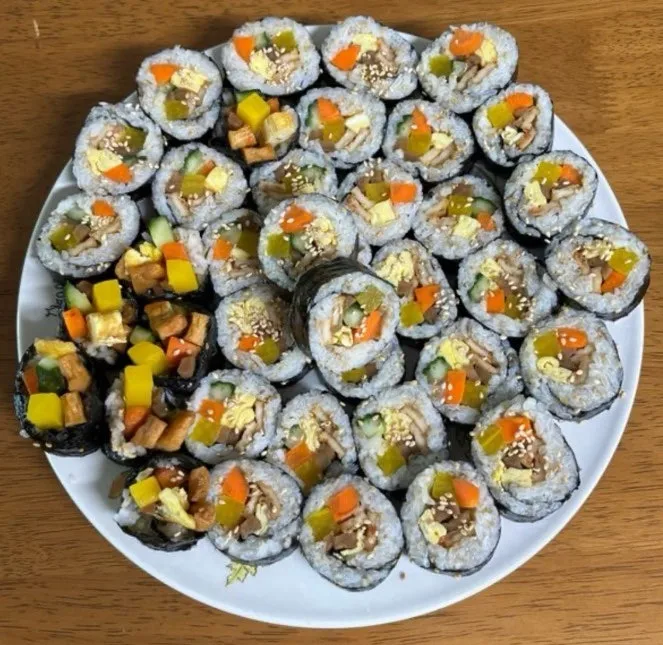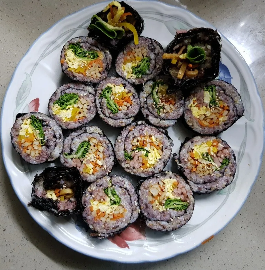 위의 김밥은 엄마가 몸이 아프셨을 때 한동안 돌봐드렸는데 그때 싸드린 김밥이다. 흑미쌀로 만들어 더 건강하게 보인다. 그리고 이때 맛있게 드셔주셨다. 이때 속 재료를 보아하니 봄동, 당근, 단무지, 햄, 계란, 어묵이 들어갔다. 내 김밥은 그때그때 있는 재료를 사용하기 때문에 늘 즉흥이다. 아마도 봄에 쌌던 거라 그런지 봄동을 활용했고 다른 재료들은 살짝 볶아서 넣었다.