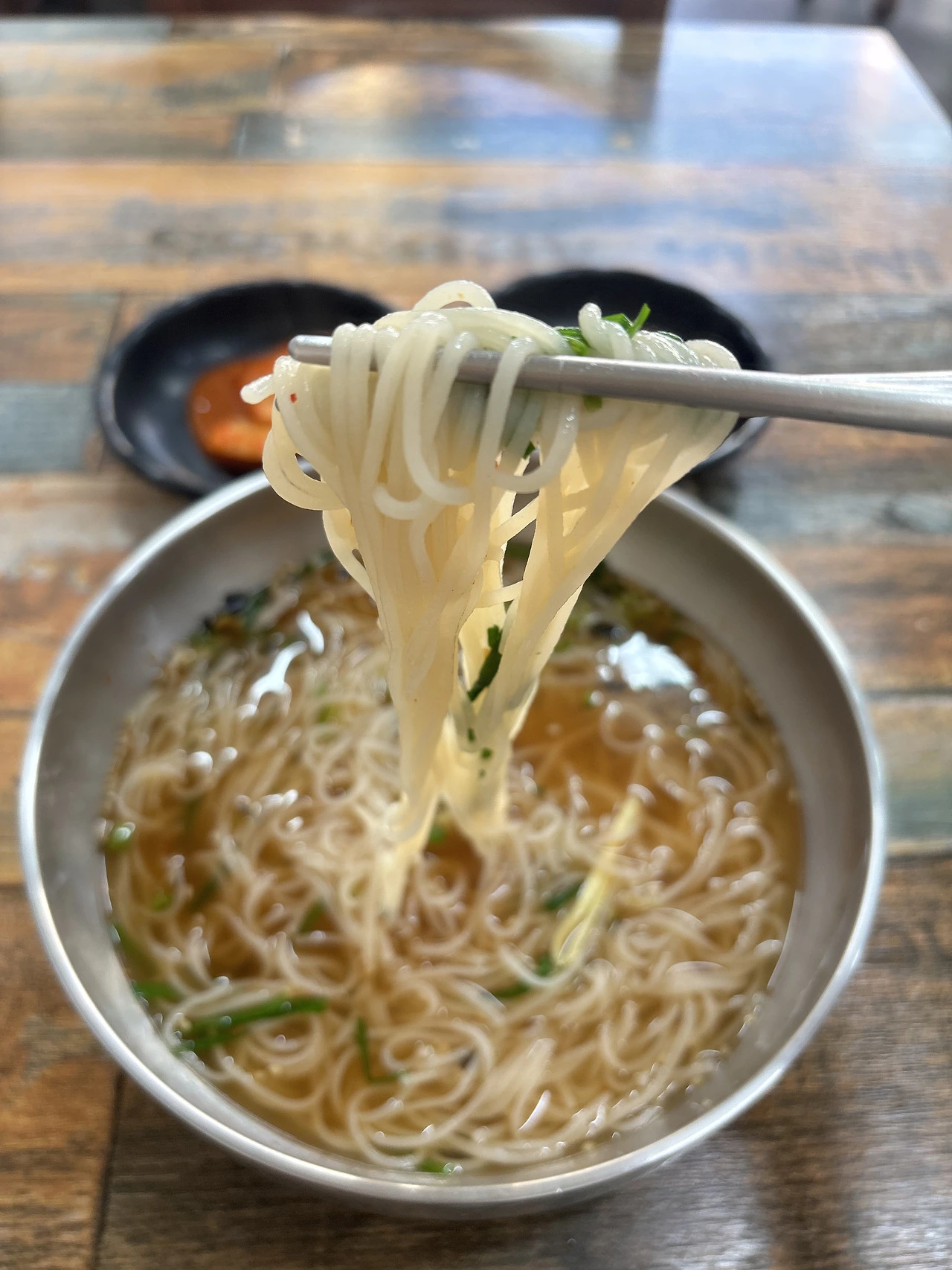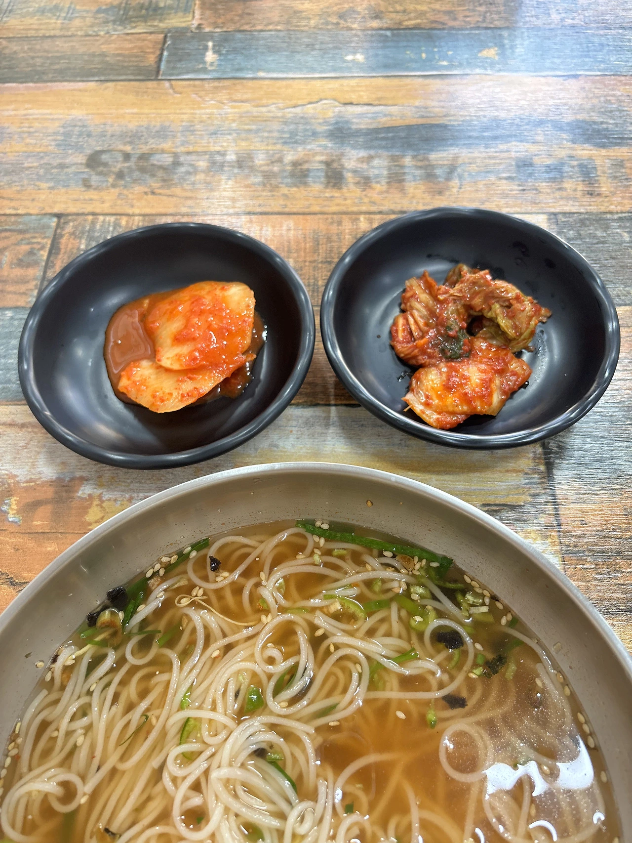 이틀 전 볼일이 있어 다시 이 동네로 왔다. 자연스럽게 이 국숫집을 방문했다. 고명은 단 두 가지였다. 숙주와 부추. 뭔데, 뭐야? 정말 두 가지라고? 근데도 이리 맛나다고? 바쁜 일을 끝내시고 두 사장님이 나오셔서 축구경기를 시청하셨다. 아주머니 사장님께 “국수장사하신 지 오래되셨나요?” 하니까 “국수 육수 뽑은 지 30년 됐어요!” 그러시는 거다. 오로지 멸치 육수만을 사용한다고 하셨다. 멸치 육수 내는데도 옆에 딱 붙어서 불조절을 잘해야 하신단다. 이 집 국수맛이 여기에 있었구나 하고 무릎을 탁 쳤다. 국수 하시기 전엔 냄비우동을 하셨단다. 국수 하나에도 사장님만의 노하우와 오랜 내공이 숨어있었구나를 알게 되었다. 섞박지 모양의 무김치는 색다른 달콤함을 선사해 주었고 배추김치에선 멍게향이 났다. 맛있다고 여쭈어보니 새우젓으로 담으셨다고 한다. 어찌 김치에서 멍게향이 났을까 신기했다.