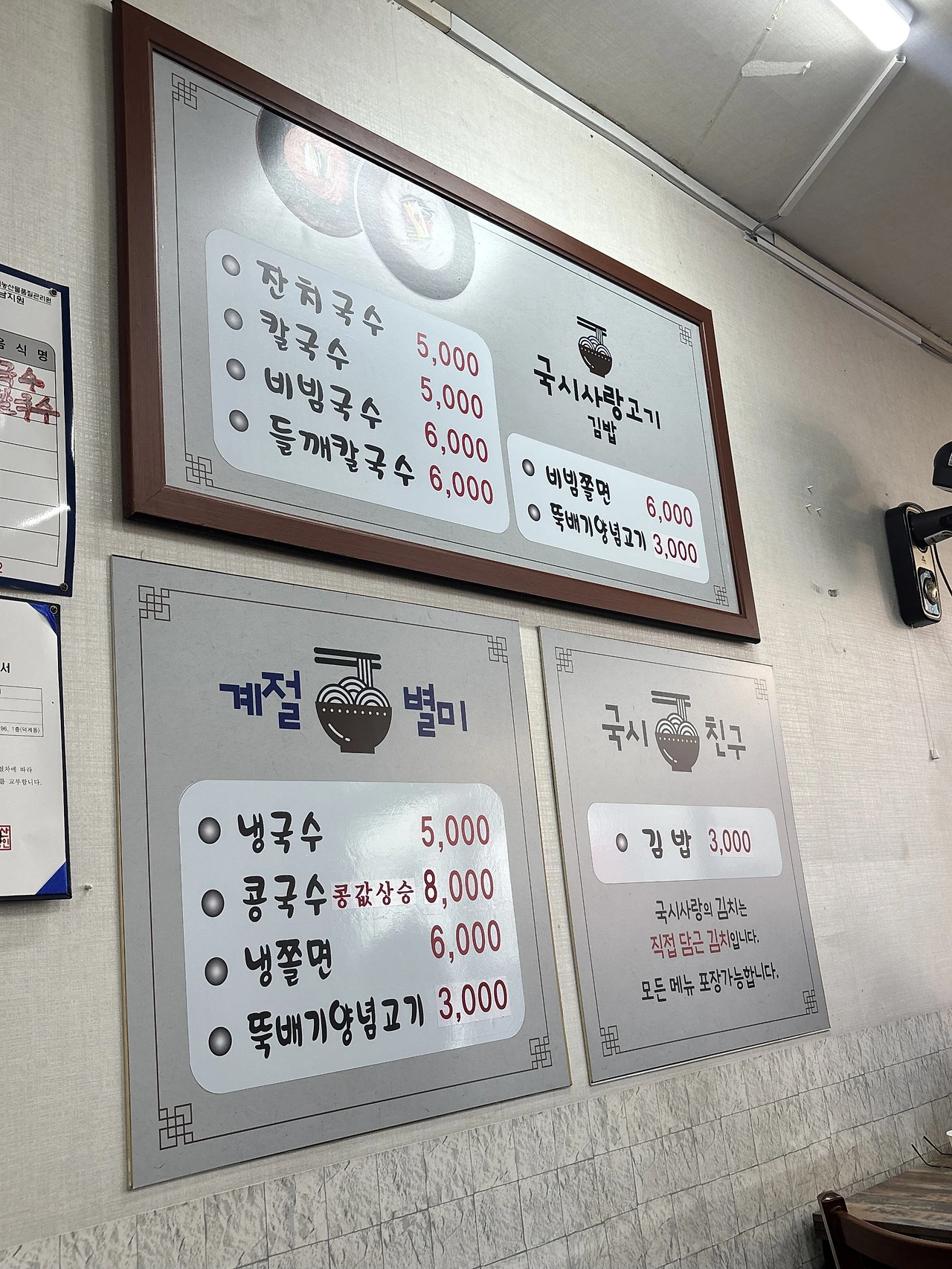 상호가 <국시사랑 고기 김밥>이다. 잠시 눈을 의심했다. 국수 고기? 그러고는 찬찬히 둘러보니 뚝배기 양념고기가 메뉴에 있었다. 뭐지? 이 집 분위기 벌써, 맛있다. 한쪽 테이블에는 남자 어르신 세 분이 국수를 드시고 계셨다. 나도 국수 한 그릇을 주문해 본다. 나이가 지긋하신 부부께서 운영하고 계셨는데 아주머니 사장님이 아저씨 사장님께 “국수 한 그릇요!”하고 말씀하시니 이내 아저씨 사장님이 국수를 말고 계신 소리가 들려왔다. 조금 기다리니 국수가 짠! 하고 식탁에 차려졌다.
