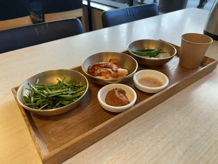 국밥 나오기 전 먼저 차려진 찬입니다. 부추무침, 겉절이김치, 고추, 양파, 쌈장, 새우젓이 이런 모양으로 나와요. 고급진 모양입니다.