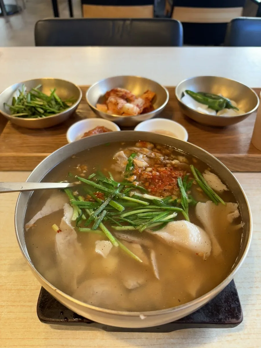 따로국밥, 토렴국밥이 메뉴에 있는데 토렴국밥을 시켰어요. 따로국밥은 만원, 토렴국밥은 천 원 더 비싼 만천 원이네요. 푸짐하게 한 그릇 나왔는데요. 미포 <수변 최고국밥> 비주얼과는 확 틀린 비주얼입니다. 말 그대로 고기를 토렴 해서 내어주고 밥을 같이 말아 줍니다. 맑은 국으로 나왔고 부추가 조금 올려져 나와요. 다진 양념도 얹어 나왔습니다. 국물이 닭곰탕 같았는데 기름기가 적어서 그런지 소화가 잘 되었습니다. 다진 양념을 풀고 먹어 보는데 깔끔한 국물맛입니다. 고기식감은 쫀득 쫀득이네요.