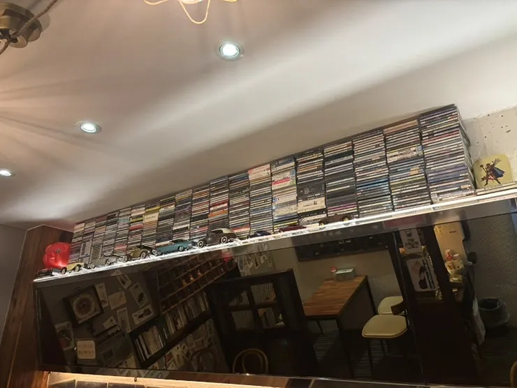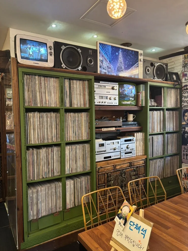 여기는 단체석 공간. LP가 장엄하게 꽂혀있어 앉으려 했는데 단체석이라 다른 곳에 앉으라고 하셨다. 이 정도면 LP 양이 엄청난데 모으는 재미가 쏠쏠하셨겠다. 1500장 정도는 되겠다. 멋지다.