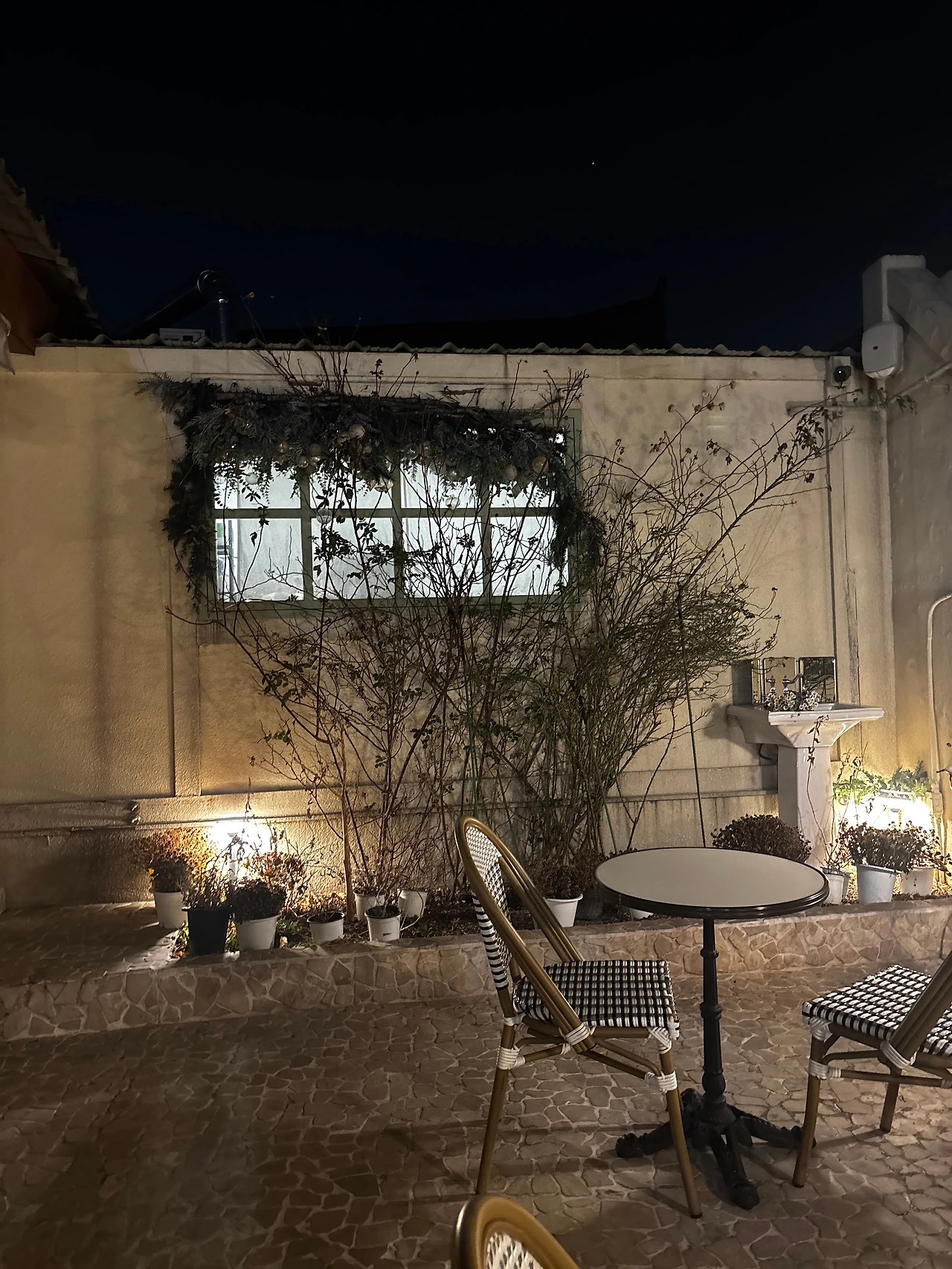 아담한 마당에 테이블과 의자들이 몇 개 보인다.