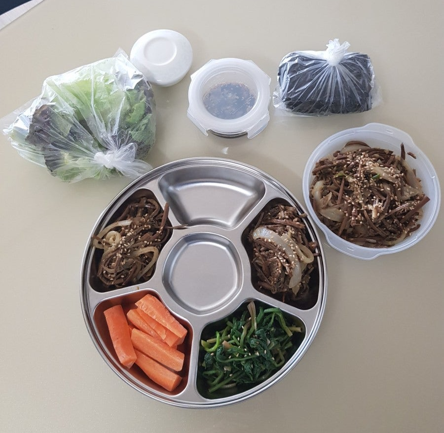 집에 늘 먹는 반찬 음식들과(상추, 양배추 찜, 시금치무침, 당근, 김, 간장, 쌈장 등) 고사리나물 볶아서 준비한 것들.