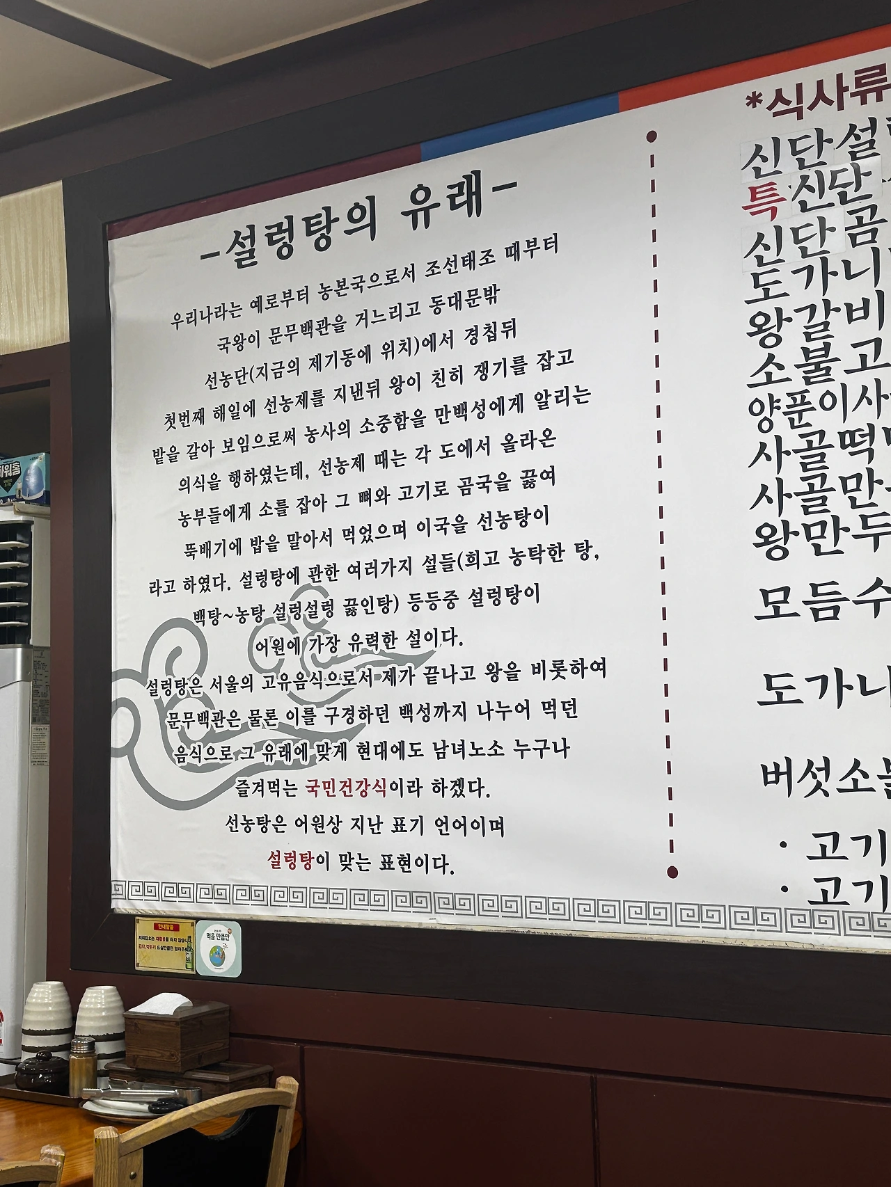 미아역 포장마차에 메뉴가 참 다양했다. 마음 같아서는 하나씩 다 맛보고 싶었지만 곰장어로 만족했다. 서울의 밤은 그렇게 막을 내렸다. 다음날 아침이 되어 인근 밥집을 찾아다녔는데 아침 일찍부터 문을 연 설렁탕집을 발견했다. 딱 봐도 맛집 포스가 느껴지는 곳이었다. 신발을 벗고 들어가니 꼭 가정집 같았다. 설렁탕 두 그릇을 주문하고 앉아 있는데 설렁탕의 유래가 적힌 글이 걸려있었다. 안 그래도 설렁탕이 왜 설렁탕일까 설렁설렁 섞어 먹으라고 설렁탕인가 생각하던 찰나에 글귀가 눈에 들어온 게 신기했다.