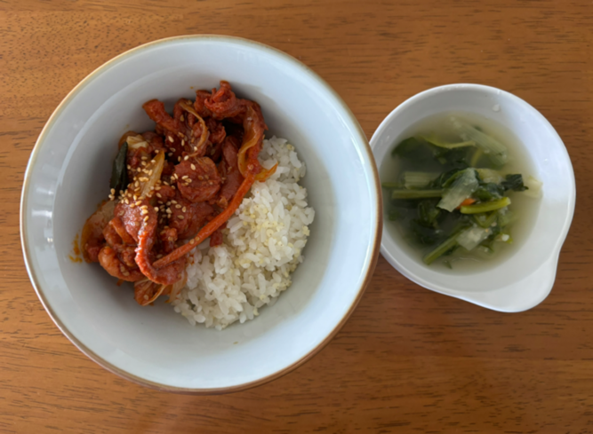 어느 날 저녁 ‘초간단하게 해결하자’ 하고 만들어 먹었던 닭갈비덮밥 & 열무김치다. 시장에서 사 온 양념된 닭을 익히고 옴팍한 그릇에 밥을 담은 다음, 익혀 둔 닭갈비를 올려주었다. 깨로 모양 내고 열무 물김치와 함께 정말 초간단하게 해서 먹었다. 시장에서 사 온 거라 레시피를 따로 적을 수도 없다.