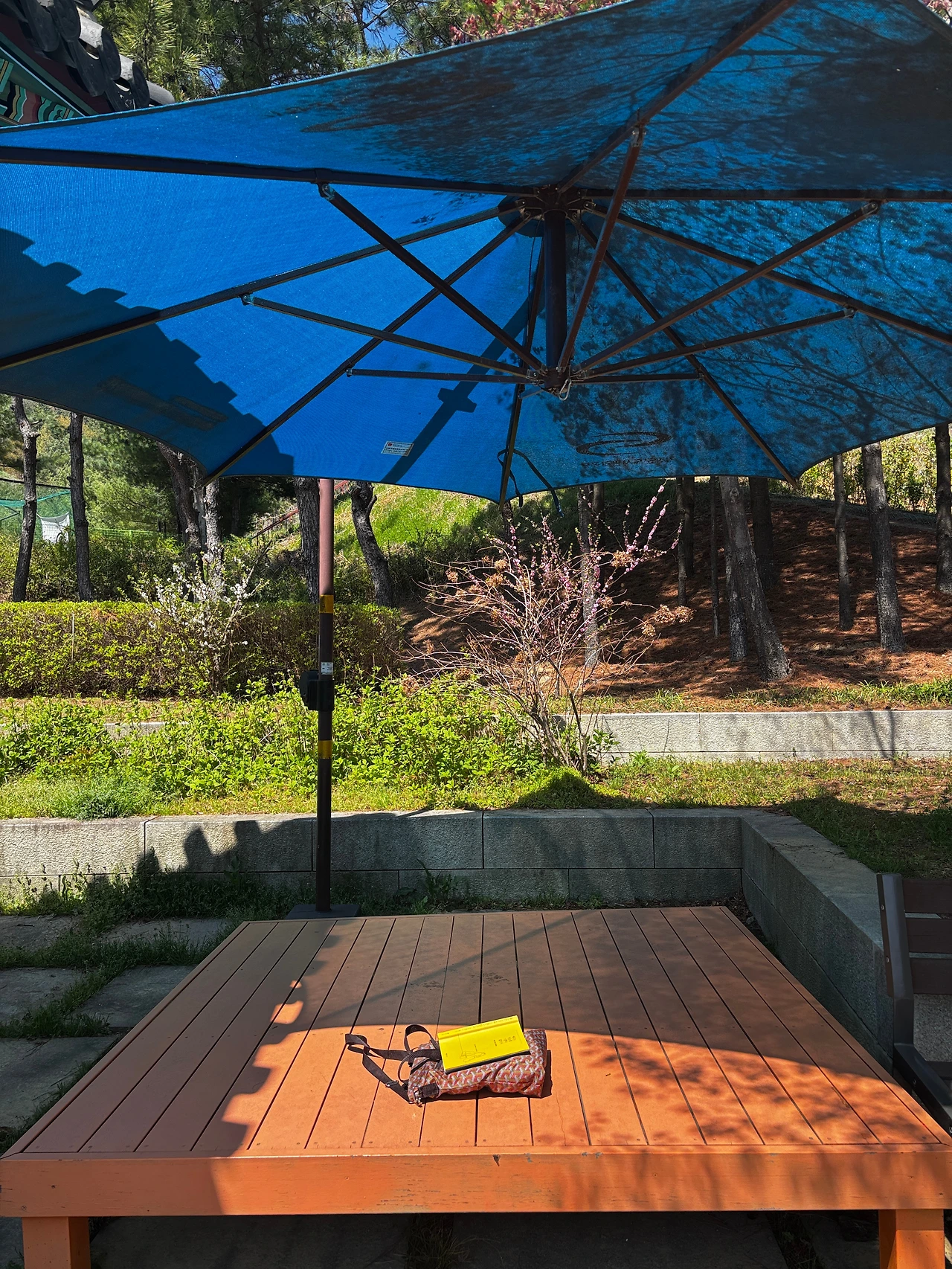 큰 파라솔이 드리워진 평상의 오후는 참 한가롭다. 이런 날 이런 시간을 보낼 수 있음이 감사하다. 바쁘게 달려왔던 지난날을 보상해 주기라도 하는 듯 평화로운 한때다. 한 분의 어르신을 만났다. 한 손엔 개 목줄을 쥐고 계셨고(개 이름 진호. 진돗개의 진, 호랑이의 호) 니코 하시며 한 마리의 길냥이에게 다가오고 계셨다. 공원에 있는 20마리 정도의 고양이의 밥을 담당하고 있다 하셨다. 점박이 니코는 신기하게도 어르신을 잘 따랐다. 공원 한 편에는 정원을 만들어 가꾸고 있으시다고. 올해까지만 한다고 하신다. 어르신의 모습에서 부지런함과 따뜻한 정스러움이 느껴졌다.
