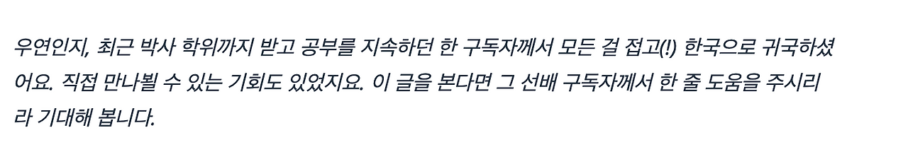 아카데믹 커리어 여정이 얼마나 고단한 것인지 너무나 잘 알고 있기에 댓글을 남기지 않을 수가 없네요 (참고로 제가 마작가님이 말씀하신 박사과정 후 모든 생활을 접고 한국으로 귀국한 사람입니다^^).