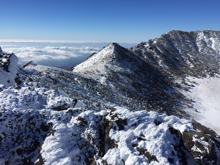 오늘의 백록담이 더 황홀했던 것은, 이 세상의 것이 아닌 듯 보이는 맑은 하늘과 하얀 눈 그리고 구름으로 덮인 세상에 있었던 것 같다. 이토록 드넓게 펼쳐지고 살아 움직이는 운해를 직접 만날 줄이야.