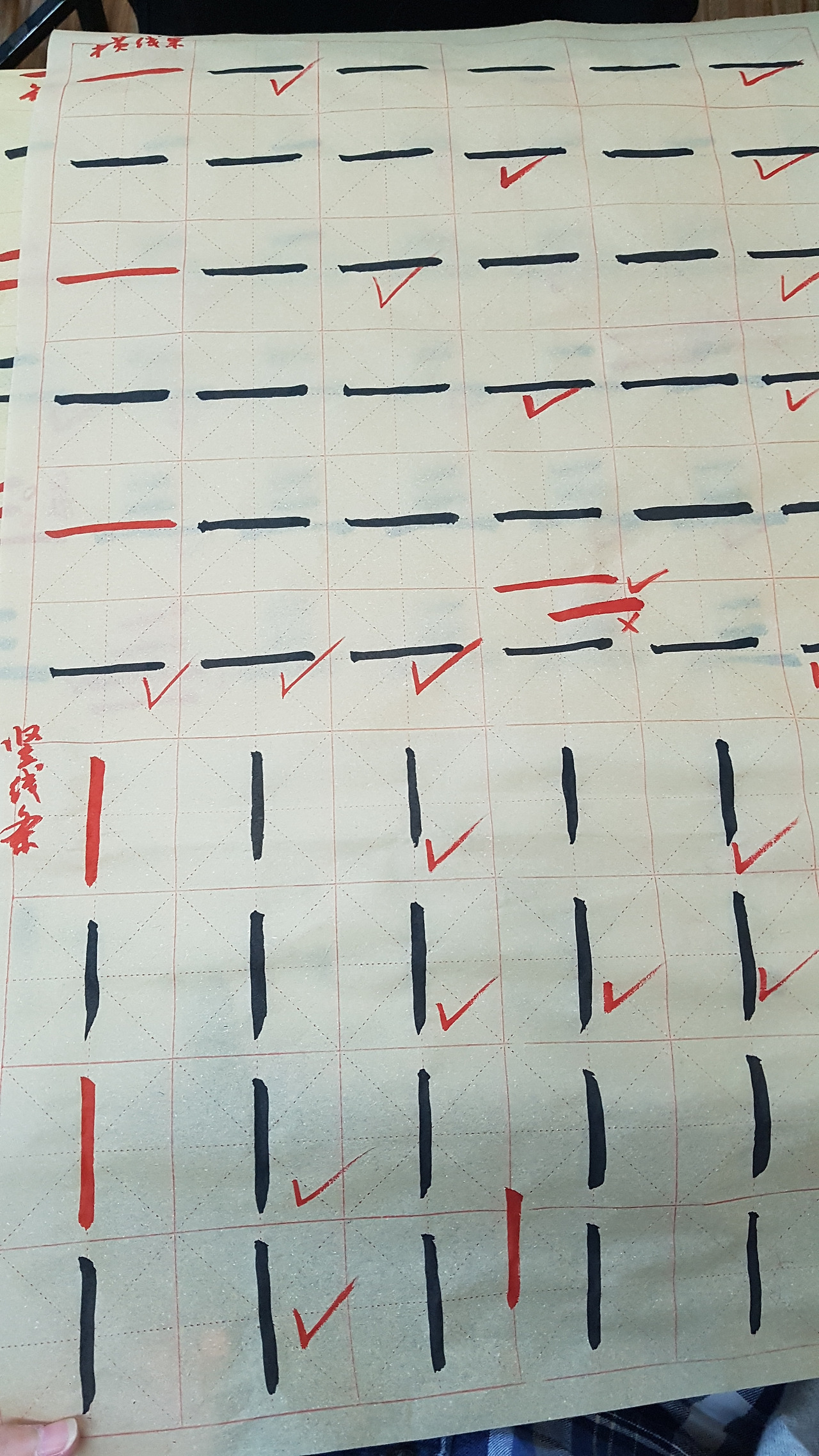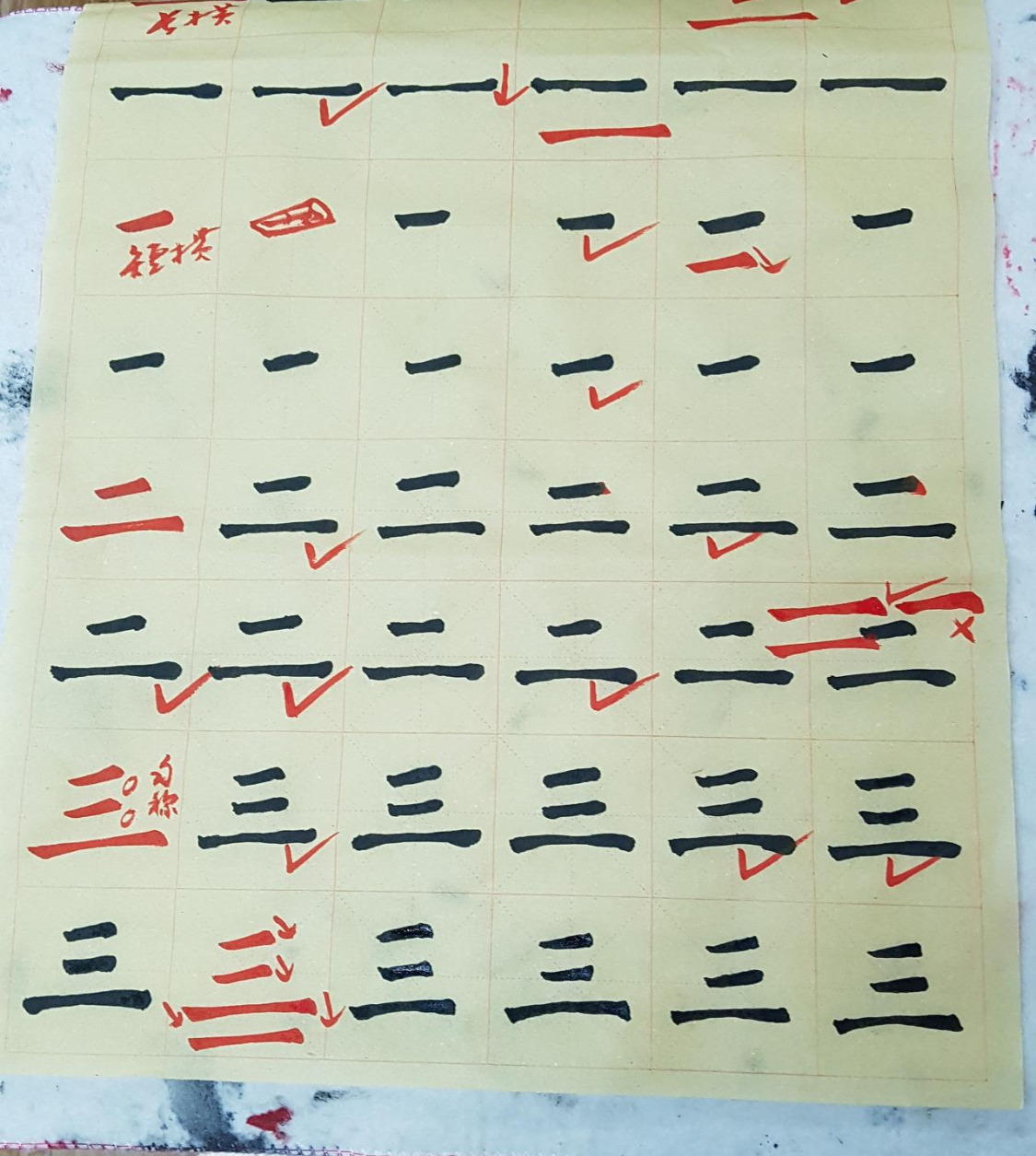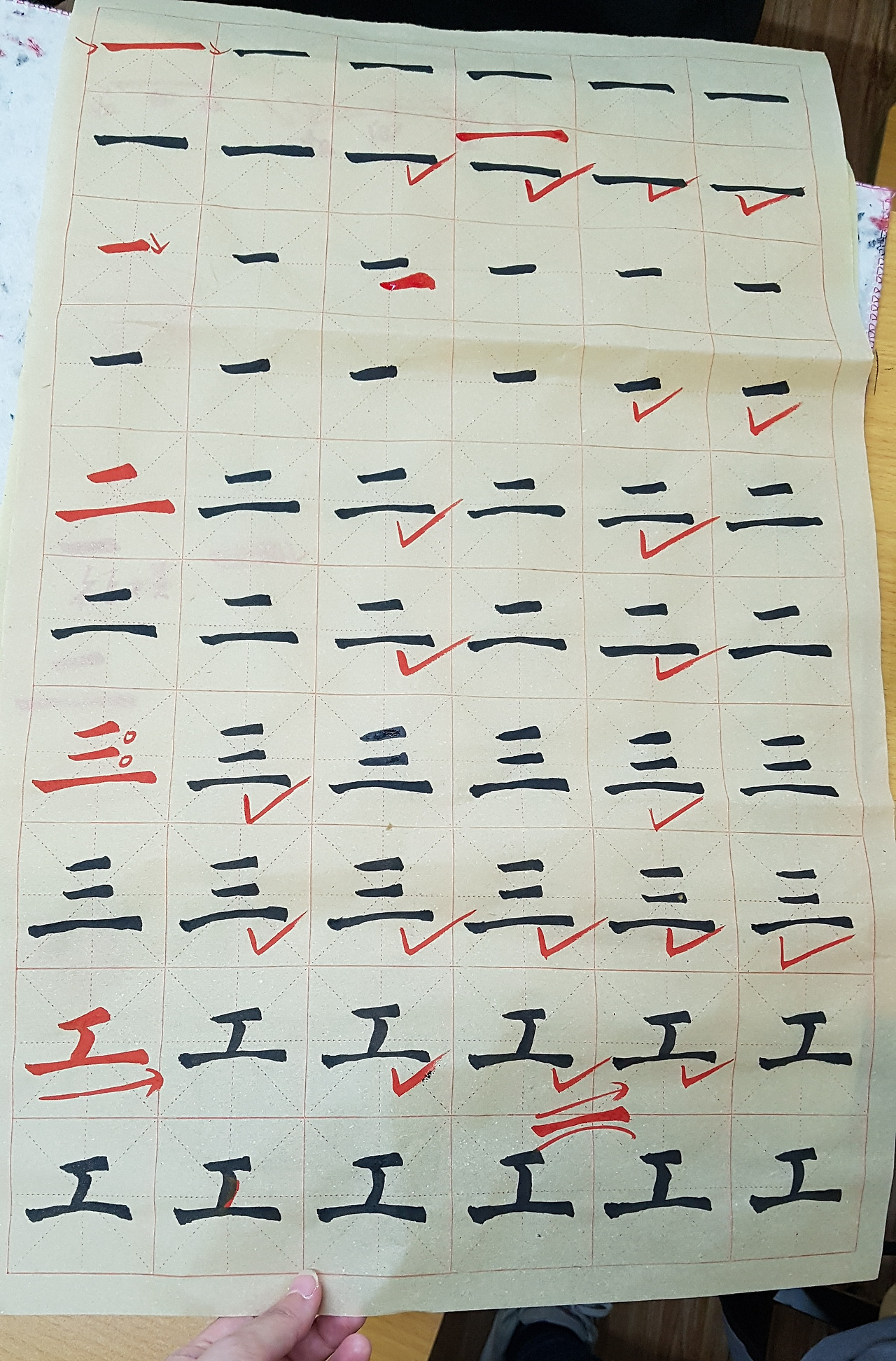 첫 수업에 내게 주어진 과제는 가로 획(横)과 세로획(竖)을 배우고 그걸 응용하여 一, 二, 三, 工을 쓰는 것. 학교 다닐 때 미술 시간에 서예를 배울 때도 선 긋는 연습을 가장 먼저 했던 것 같은데, 똑같은 원리로 선을 긋는 연습을 가장 잘할 수 있는 글자를 첫날 배우는 것이다.