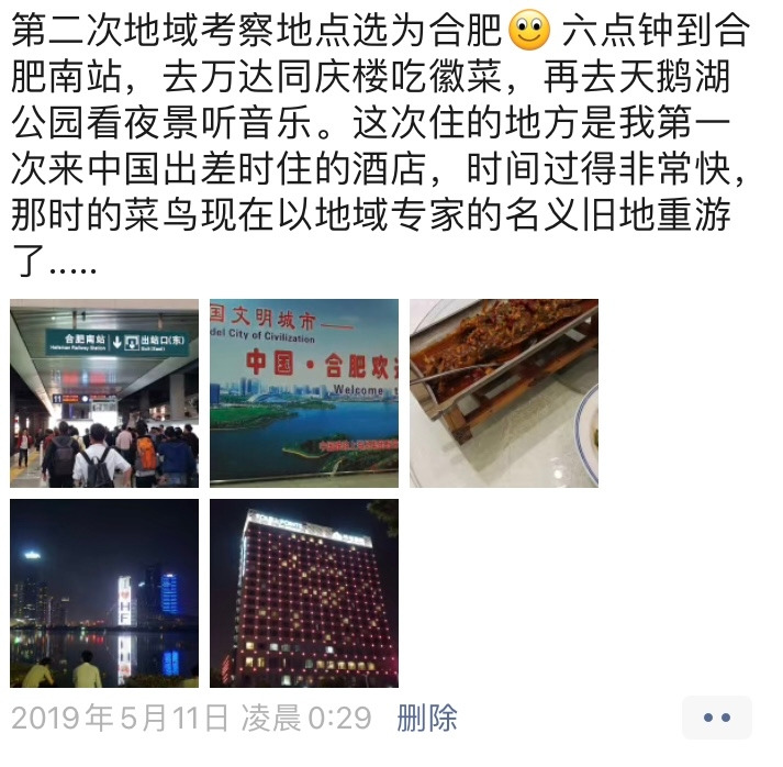 (譯) 두 번째 지역연구 목적지는 허페이로 정했다! 6시쯤 합비남역에 도착해서 완다 통칭러우(同庆楼)에서 안휘성 음식 먹고, 톈어후공원에서 야경을 보며 음악을 들었다. 이번에 묵는 숙소는 내가 처음으로 중국에 출장을 갔을 때 묵었던 호텔이다. 시간 참 빠르다. 그때의 왕초보 병아리가 지금은 지역전문가의 신분으로 다시 오다니..