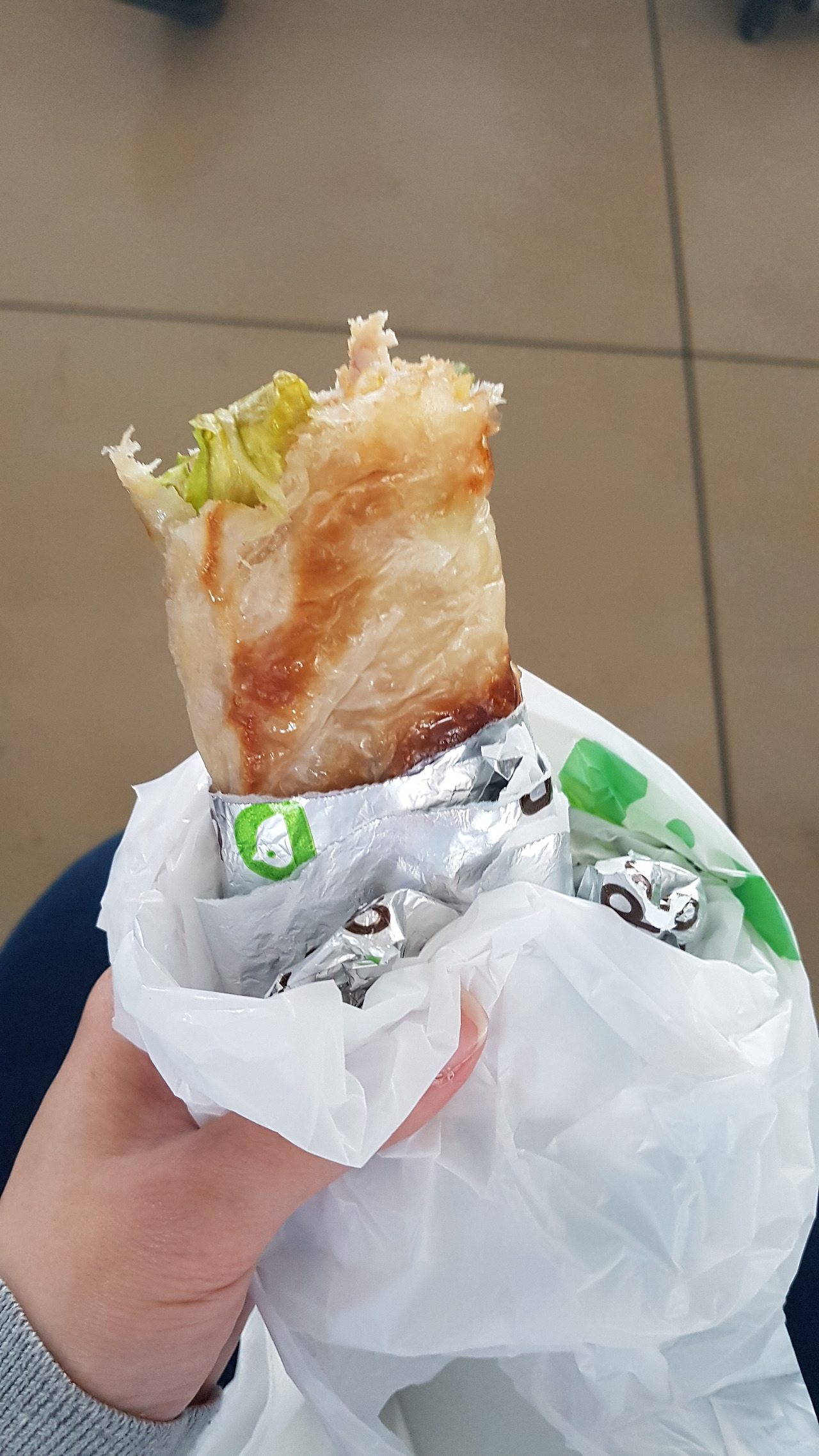 여섯 시쯤 합비남역에 도착할 예정인 데다 도착 후에도 호텔 체크인 등 할 일이 많으니 뭐라도 좀 먹어둬야겠다 싶어 산 것이 중국식 패스트푸드 브랜드 중 하나인 DICOS(德克士)의 치킨 랩. KFC의 트위스터를 기대하며 산 것이지만 맛이 전혀 다르다. 너무나도 중국인 입맛에 맞춰 현지화된 그런 맛. 다음부턴 굳이 사 먹지 않겠다고 다짐하며 반절 정도를 남겼다. 역시 중국에서 패스트푸드를 먹으려면 어느 정도 검증된 브랜드를 먹어야 한다. 안 그러면 익숙지 않은 중국 맛을 느끼게 될 수 있다.