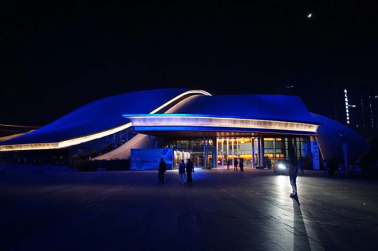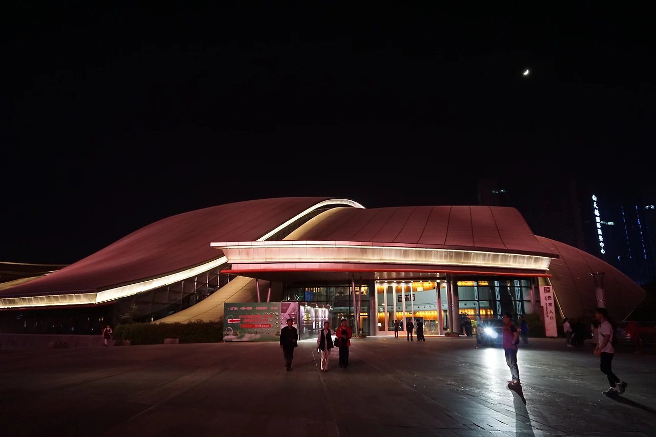완다광장을 지나 조금 더 걸으면 색색깔로 빛나는 건물 하나가 나오는데, 뭔가 하고 가까이 가서 보니 허페이 대극장(合肥大剧院)이다. 2009년에 지어져 2010년에 대외개방되었다는 이곳은 얼핏 보면 시드니 오페라하우스를 오마주한 것이 아닌가 하는 생각이 드는 비슷한 디자인을 갖고 있다. 마침 무언가 공연이 끝날 즈음이었는지 공연을 관람하고 나오는 관객들이 보인다.