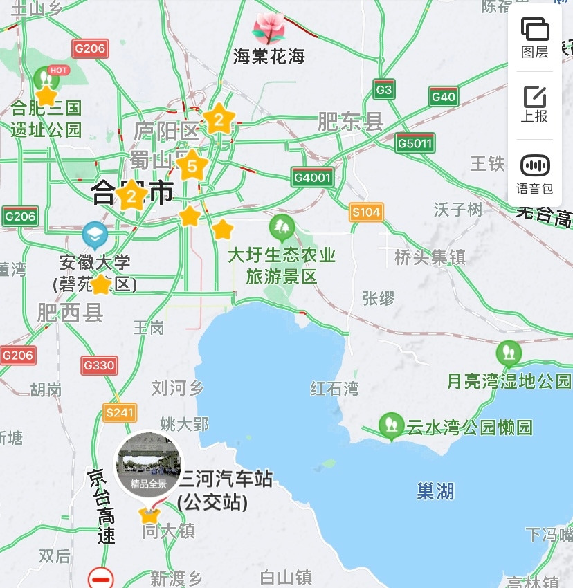 싼허구쩐(三河古镇)이라는 이름에서 구쩐(古镇)은 옛 마을이라는 뜻인데, 싼허라는 이름은 어떻게 생긴 걸까? 페이시현(肥西县)과 루쟝현(庐江县) 사이에 위치한 이 마을은, 3개의 강이 만나는 곳이라고 하여 명나라 때부터 싼허(三河, 삼하)라는 이름이 붙었다. 한국으로 치면 양수리(两水里) 같은 느낌일까? 본래 이곳은 오른쪽 지도에 보이는 저 큰 호수, 챠오후(巢湖)에 있던 작은 섬에 불과했는데 장기간의 걸친 퇴적 작용으로 육지가 되었고, 지금 볼 수 있는 마을의 형태가 되었다고 한다.