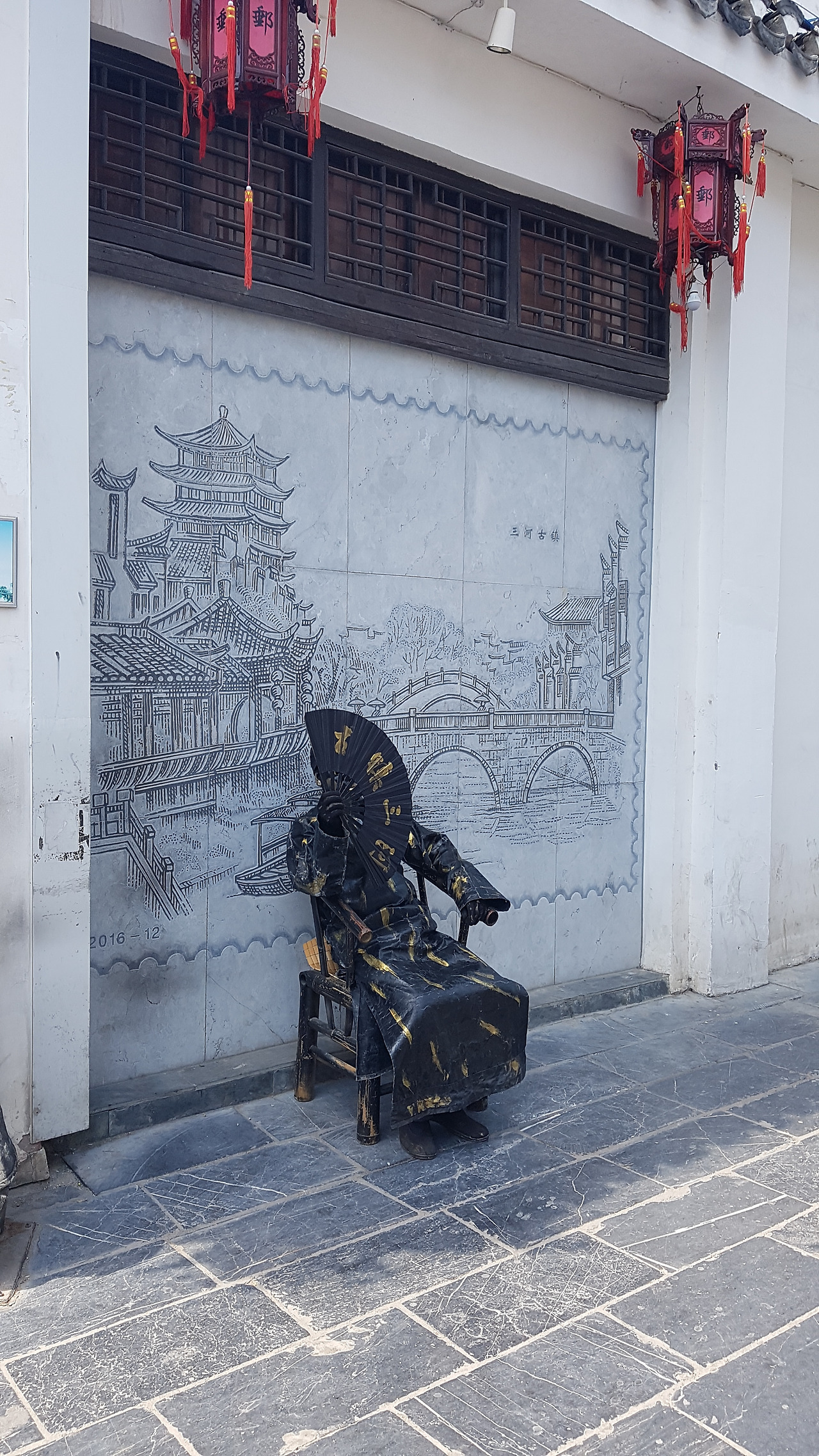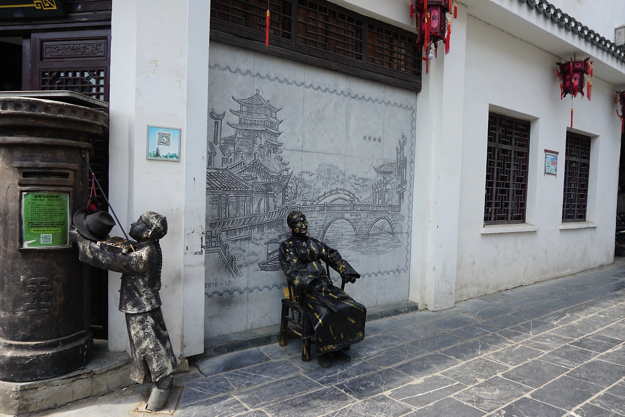 관람을 마치고 다시 발길 닿는 대로 걷다 보니 싼허구쩐 우체국(三河古镇邮局)이 나온다. 진짜 우체국은 아니고, 싼허구쩐의 모습을 담은 엽서를 팔고 직접 이곳에서 내용을 적어서 우체통에 넣고 일정 비용을 지불하면 부쳐주는 곳인데, 역시나 젊은 여성들이 가게 안에 가득했다. 밖에 나와 보니 동상처럼 보이는 무언가가 있었는데, 갑자기 부채를 꺼내더니 스윽 편다. 사람이었다. 더운지 도통 그늘 밖으로 나오질 않는데, 그의 사진을 찍는 것은 무료지만 그와 사진을 찍으려면 돈을 내야 한다. 이후 청두(成都)의 콴자이샹즈(宽窄巷子)에서도 동일한 업계(?)에 종사하는 분들(그때는 콤비였다)을 만날 수 있었는데 아무래도 관광지마다 있는 행위예술가인 모양이다.