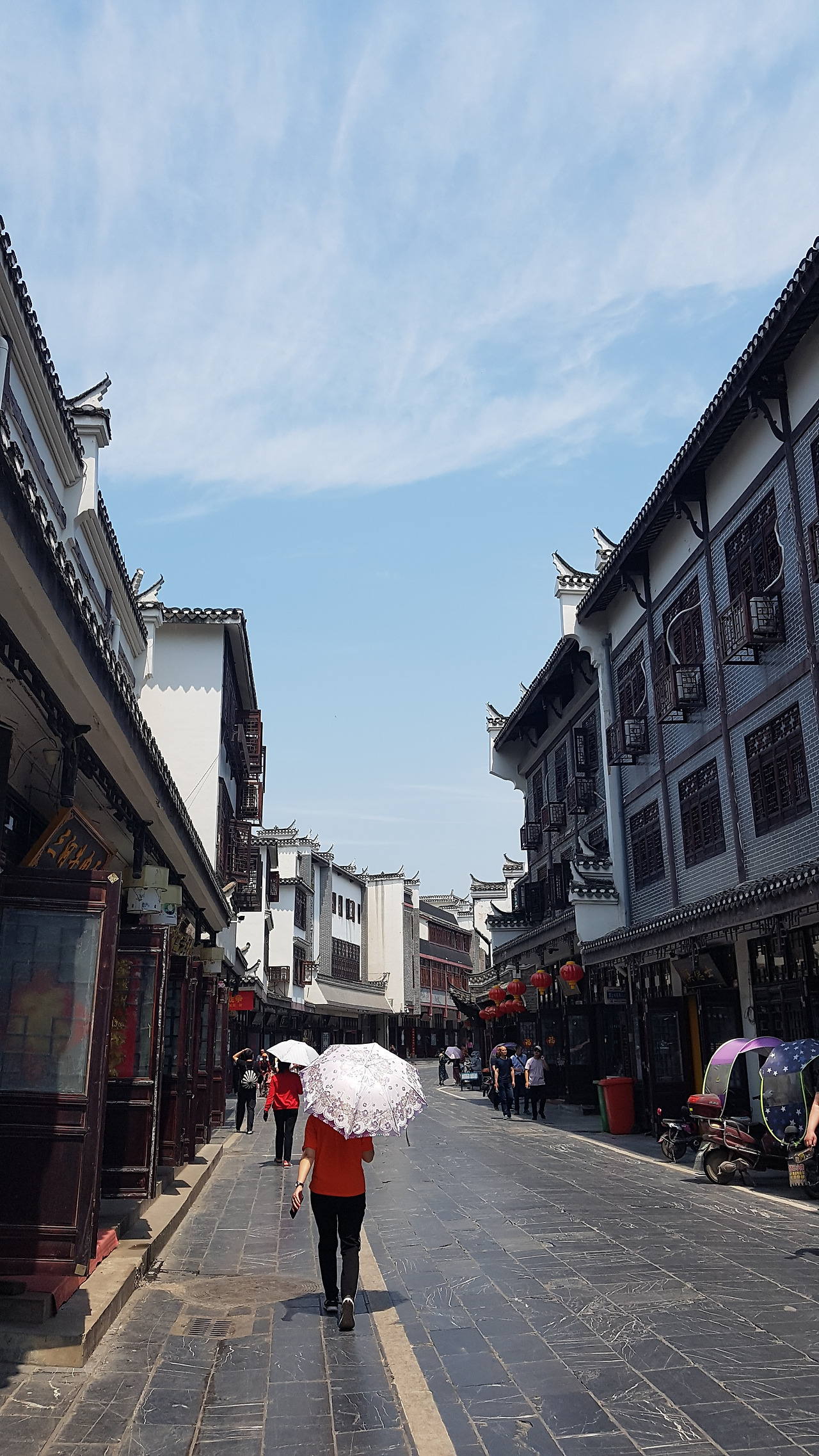 사람들이 가는 길을 따라 쭈욱 걷다 보니 어느덧 자동차 통행금지 표지판이 나온다. 얼마 되지 않아 누가 봐도 대문처럼 보이는 큰 문이 하나 등장하는데, 이 문 너머가 바로 싼허구쩐이다. 문을 기점으로 바닥도 아스팔트 바닥에서 돌바닥으로 바뀌고, 건물들의 모습도 조금 더 고풍스러운 디자인으로 바뀐다. 이미 정오에 가까운 시간이라 바닥의 돌이 햇빛의 뜨거움을 머금고 있어 자연스럽게 그늘을 찾게 된다.
