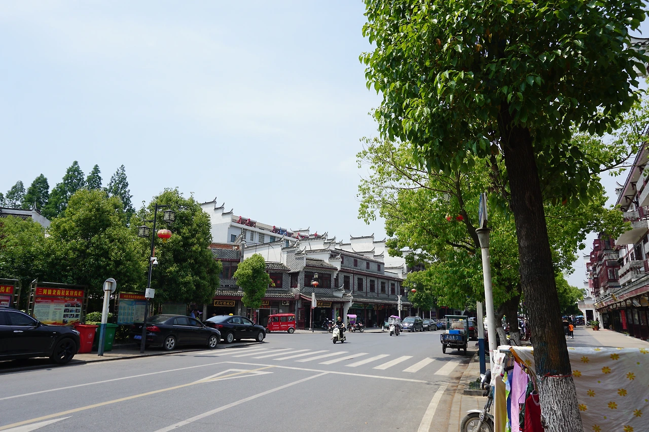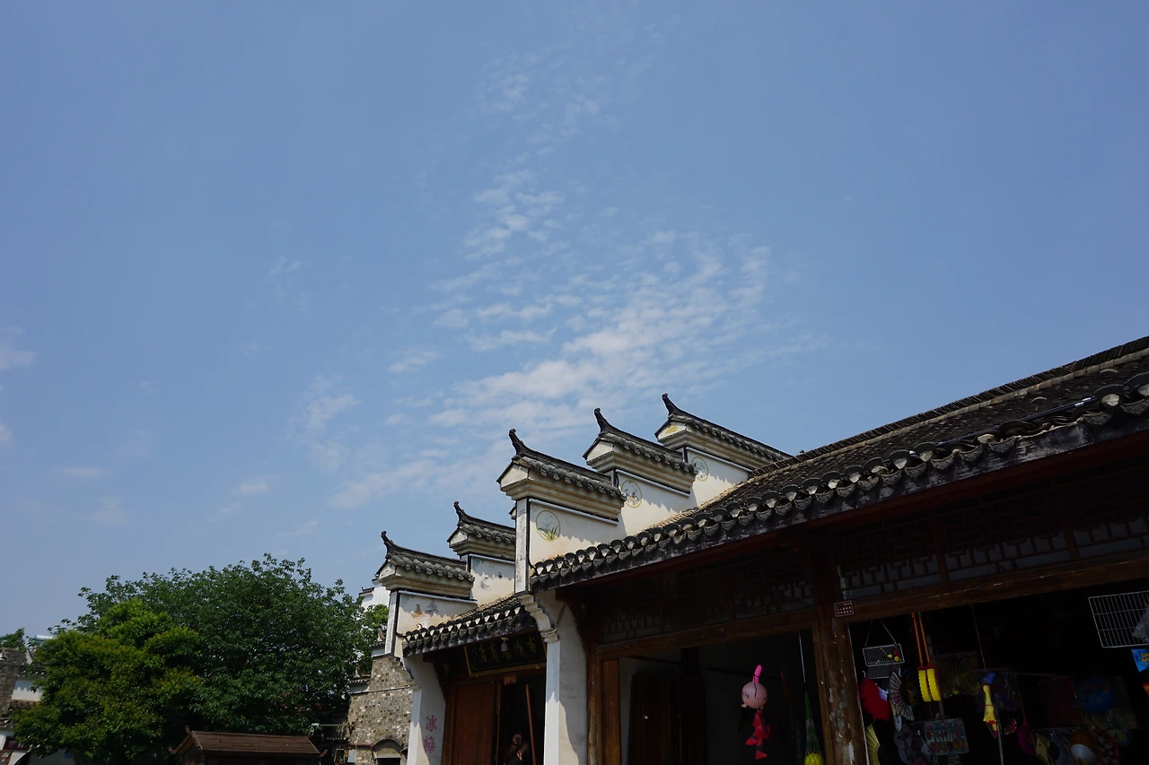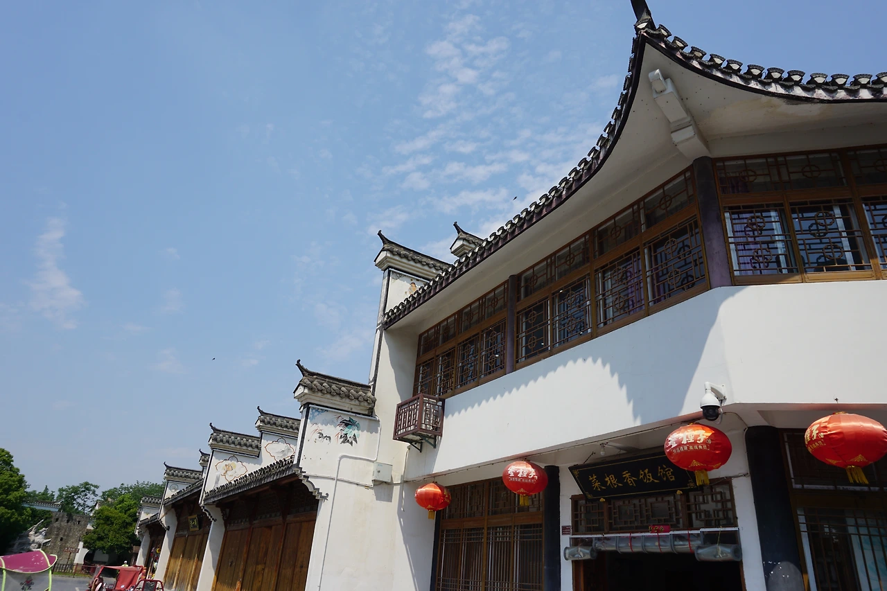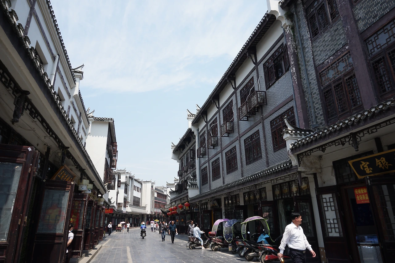 시외버스에서 내려 지도에 싼허구쩐을 찍고 걷기 시작한다. 명색이 '옛 마을'이 있는 동네답게 도로 양쪽으로 보이는 건물들이 모두 고풍스럽게 치장되어 있다. 특히 건물의 처마가 특이하게 치솟아있는 모습을 볼 수 있는데, 이는 마터우챵(马头墙, 마두장)이라고 불리는 전통 건축 양식의 하나로 휘파(徽派, 안휘성 스타일) 건축 양식의 특징 중 하나로 알려져 있다.