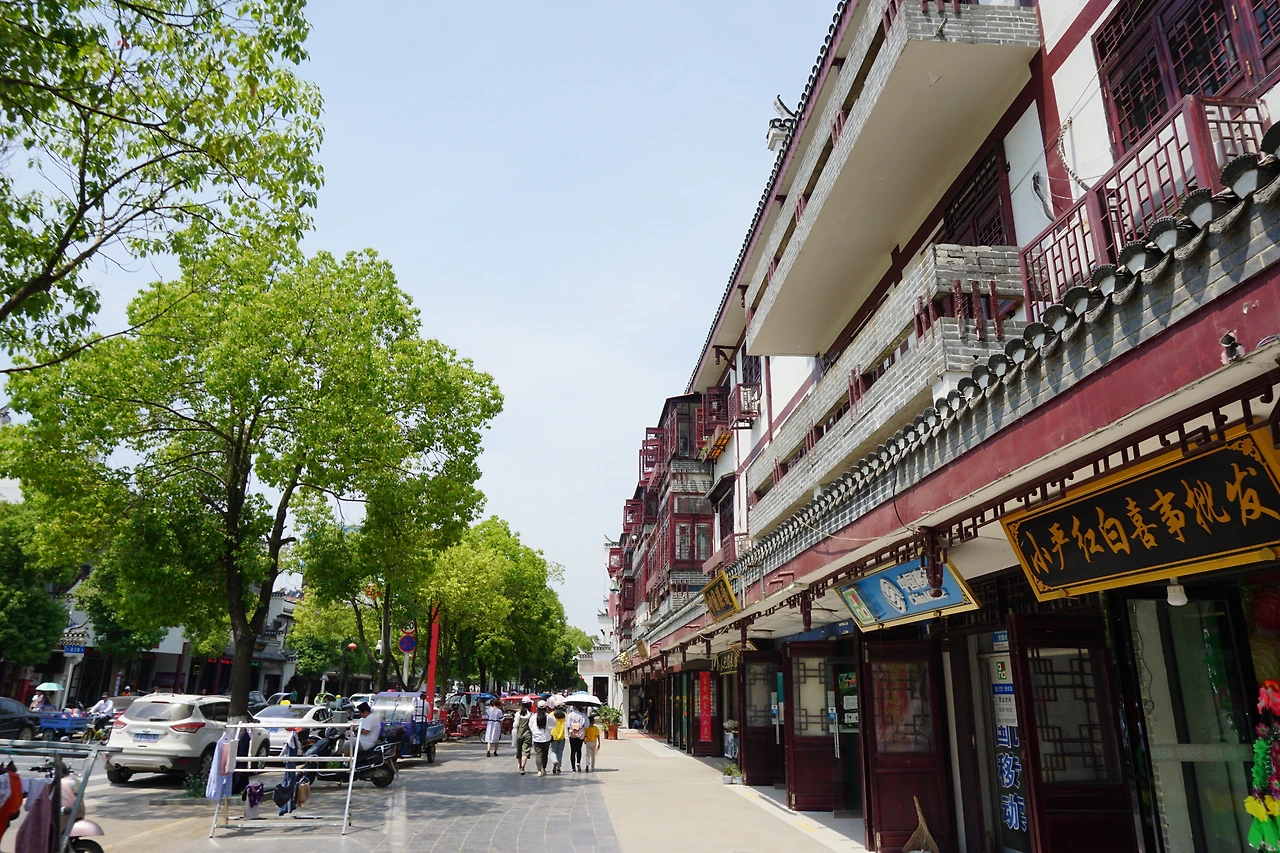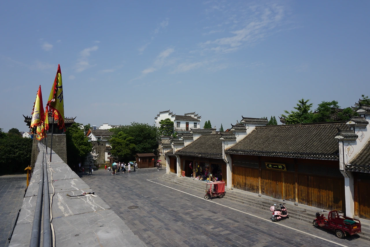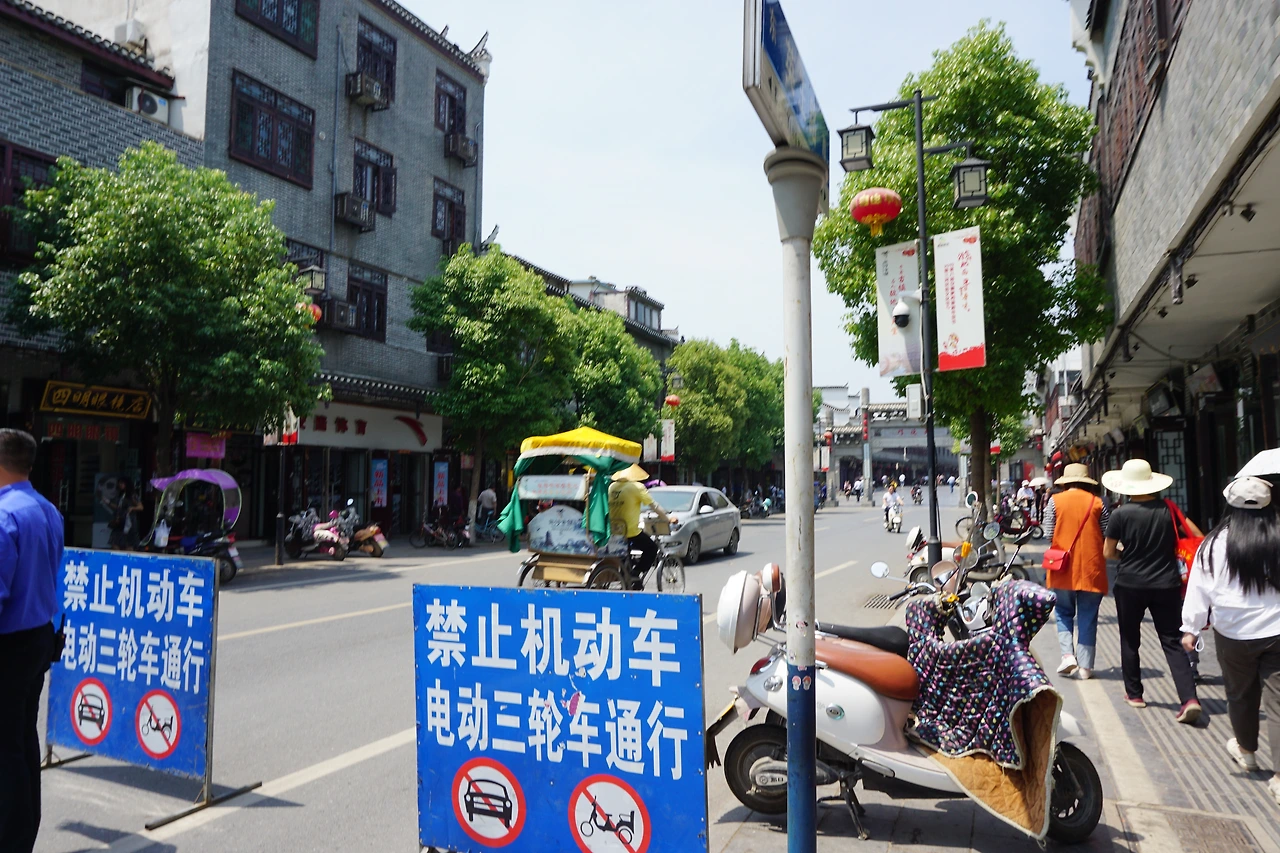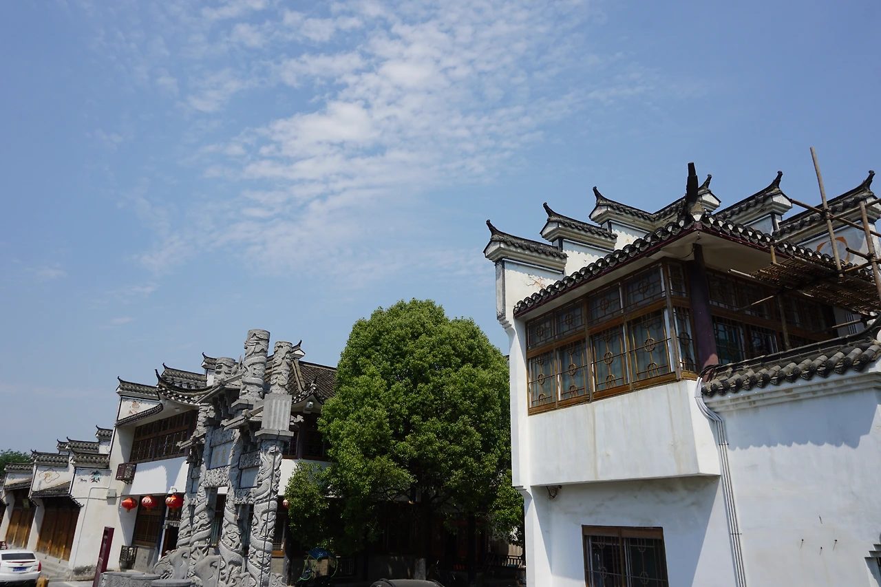 시외버스에서 내려 지도에 싼허구쩐을 찍고 걷기 시작한다. 명색이 '옛 마을'이 있는 동네답게 도로 양쪽으로 보이는 건물들이 모두 고풍스럽게 치장되어 있다. 특히 건물의 처마가 특이하게 치솟아있는 모습을 볼 수 있는데, 이는 마터우챵(马头墙, 마두장)이라고 불리는 전통 건축 양식의 하나로 휘파(徽派, 안휘성 스타일) 건축 양식의 특징 중 하나로 알려져 있다.