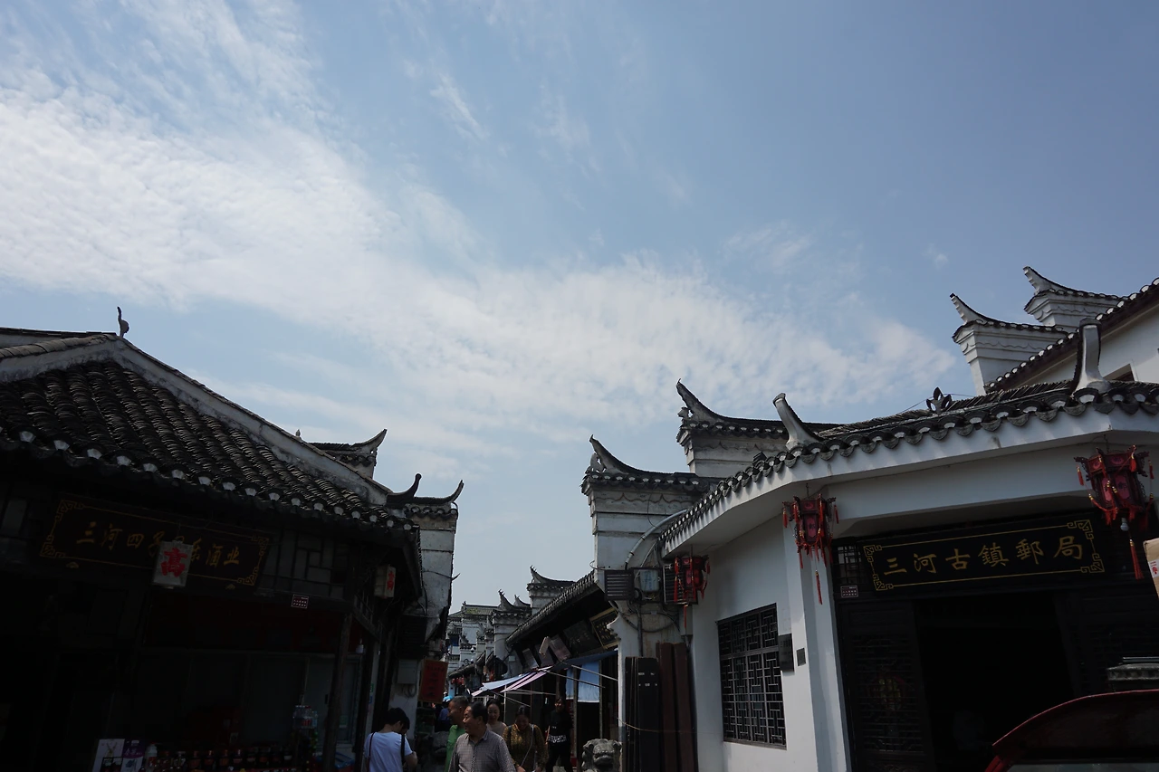 이제 와서 밝히지만 사실 허페이 시내에는 몇 개의 공원이나 박물관 빼고는 가볼만한 곳이 거의 없다. 하지만 이미 지역연구의 목적지가 된 이상 2박 3일의 일정을 알차게 채우기는 해야 하는 법! 그래서 교외에 있는 볼거리를 찾다가 발견한 곳이 바로 이 싼허구쩐이다. 명, 청, 태평천국에 이르는 시대의 옛 건축물들이 그대로 남아있는 옛 마을인데, 특히 안휘성 전통 건축양식인 휘파(徽派)의 건축양식이 잘 드러나는 건물들이 많다고 알려져 있다. 휘파의 건축양식을 잘 볼 수 있는 곳으로는 안휘성의 또 다른 유명한 옛 마을, 홍춘(宏村, 굉촌)이 있는데 이곳은 황산 근처라 허페이 시내에서 가기는 좀 멀다. 싼허구쩐은 홍춘보다는 유명세가 덜하지만 바로 그렇기 때문에 오히려 덜 북적거리고 느긋하게 둘러볼 수 있다.