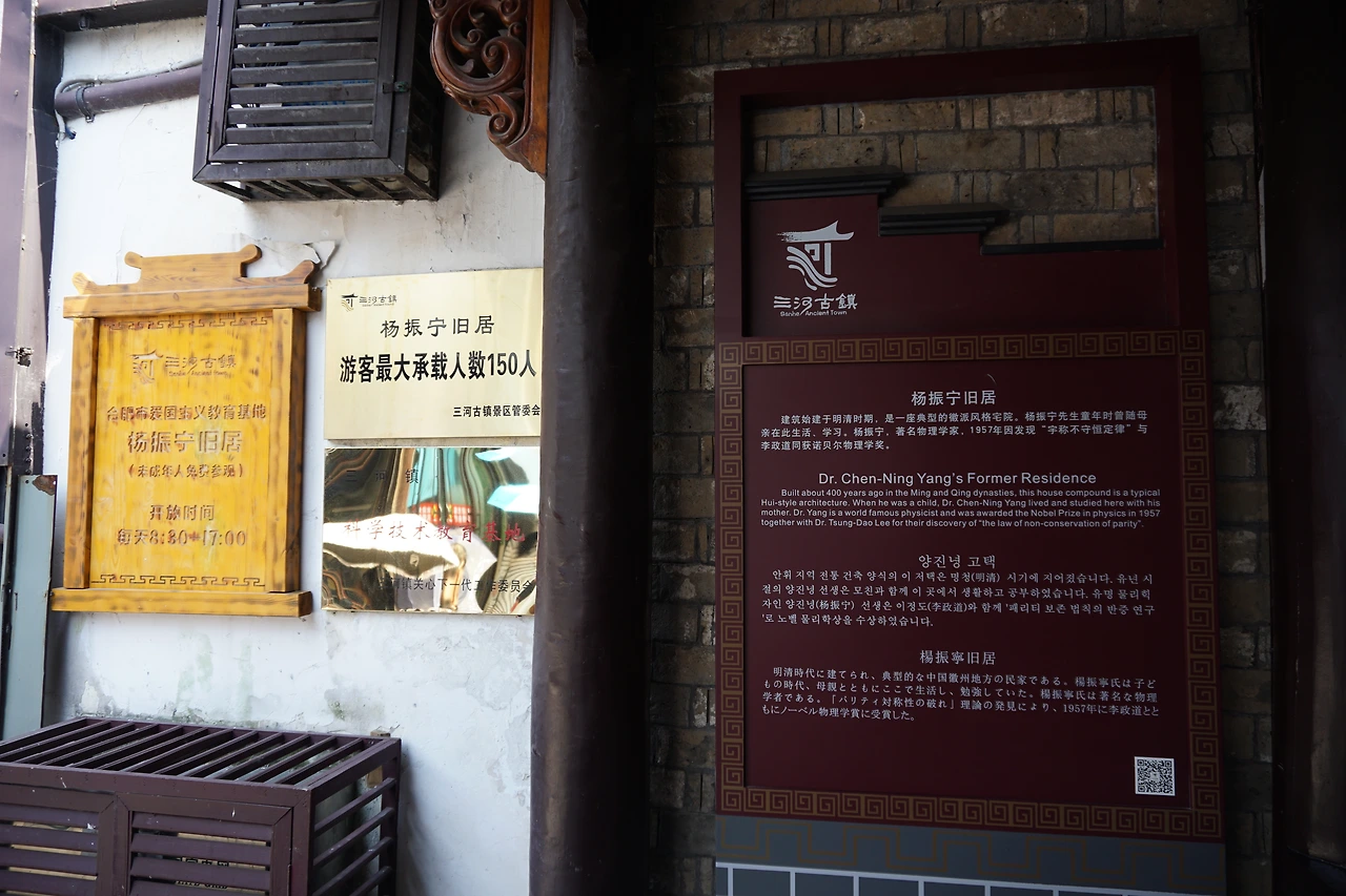 싼허구쩐에는 유명인 몇 명의 옛 주거지가 남아있는데, 그중에서 나는 중국인 최초의 노벨 물리학상 수상자 양쩐닝(杨振宁)의 옛 집에 가보기로 했다. 생애 대부분의 시간을 외국에서 보냈던 양쩐닝의 유일한 중국 거처였고, 그것이 이 작고 작은 허페이의 싼허이니, 싼허 사람들이 이곳을 박물관으로 만들지 않았을 리가 없다. 사실 문송한 나는 이분의 존재를 이곳에 와서 처음 알았는데, 비록 미국에서 상을 받은 사람이라고 해도 싼허의 자랑이라고 할 수 있겠다. 표값은 어학당 학생증이 인정되어 반값인 15위안.