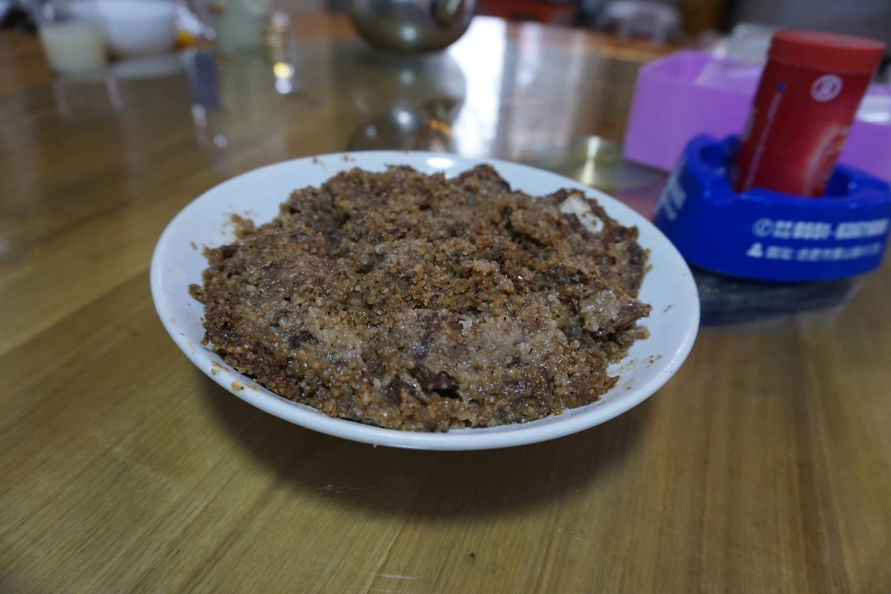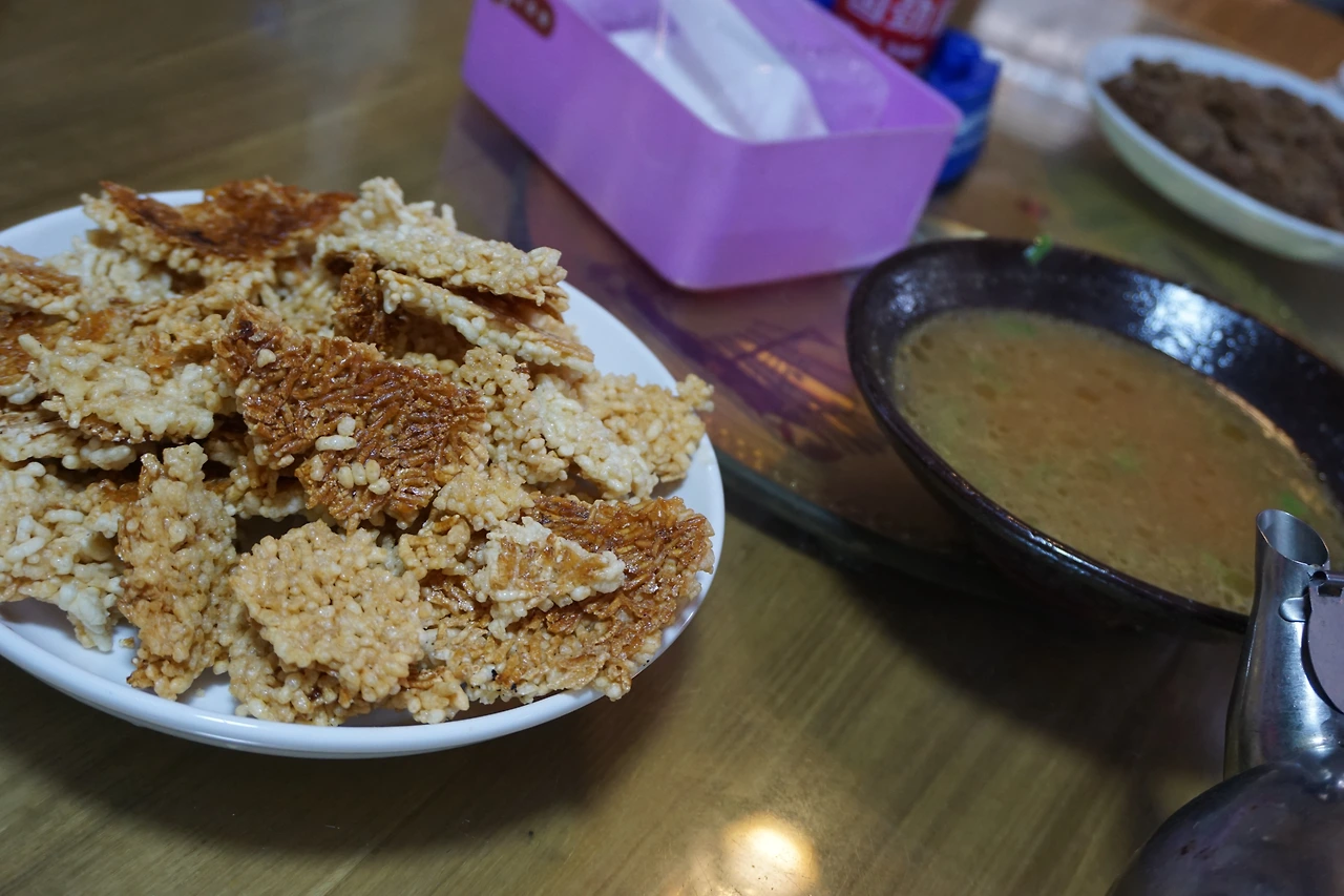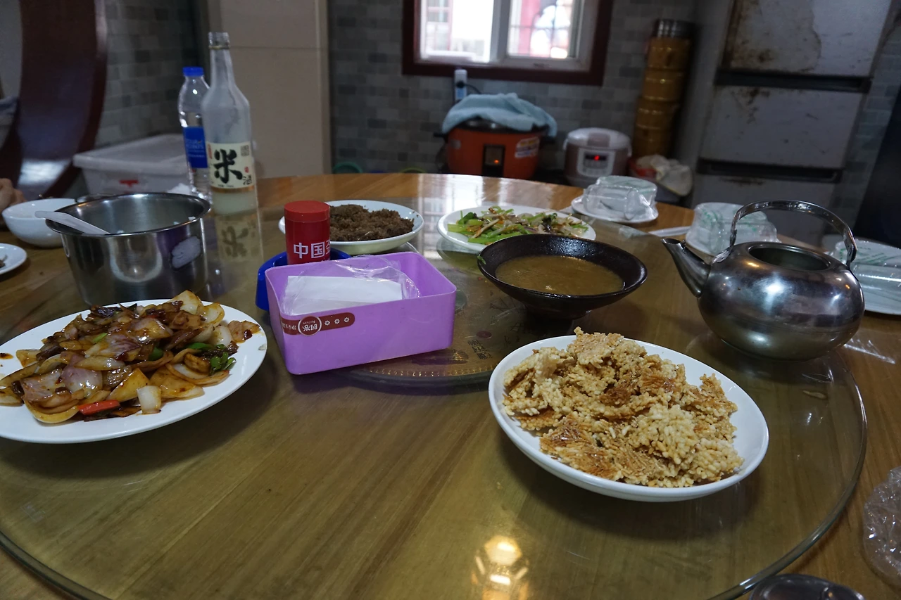 아마도 그림이나 사진이 없는 메뉴판이 있던 식당이었던 것으로 기억하는데, 따중뎬핑 어플의 도움으로 추천요리 위주로 주문을 할 수 있었다. 주로 쌀이나 찹쌀로 만든 요리가 특색인지 쌀가루 갈비(米粉排骨), 누룽지(锅巴) 등에 추천 표시가 많이 붙어있었다. 일단 추천을 받고 있는 갈비 요리와 농가 특색 누룽지(农家特色锅巴), 그리고 혹시 이 메뉴들이 실패할까 무서워 시키기로 한 항상 안전한 메뉴 후이구어러우(回锅肉), 시키고 보니 너무 고기만 시켰다 싶어 양심에 찔려 추가한 야채볶음 싼허샤오차오(三河小炒), 마지막으로 지역 특산물 중 하나인 쌀술(米酒)까지 주문 완료.