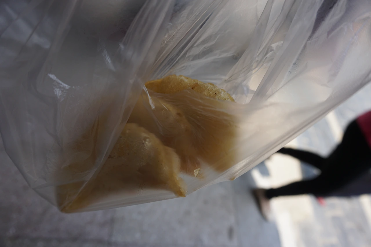 식당에서 나름대로 현지 느낌 물씬 나는 농가 요리(农家菜)를 경험하고 나서, 다시 구쩐 구경에 나서 보는데, 간판 중에 유난히 쌀 미(米) 자가 많이 보인다. 이곳이 쌀의 교역을 많이 해서 그랬던 것인지, 쌀로 된 음식들이나 음료, 간식거리 중 유명한 것이 많은데, 점심때 먹은 미지우(米酒)가 그렇고, 지금 눈앞에 보는 미쟈오(米饺)가 또 그렇다. 싼허구쩐에 가면 꼭 미쟈오를 먹어보라는 말이 있어 간판이 눈에 띈 김에 먹어보려고 주문을 했다. 중국 특유의 왠지 안전해 보이지 않는 비닐봉지에 방금 튀겨 뜨거운 미쟈오를 담아주는데, 환경호르몬을 생각하면 먹으면 안 되는 건 아닌지 불안해진다.