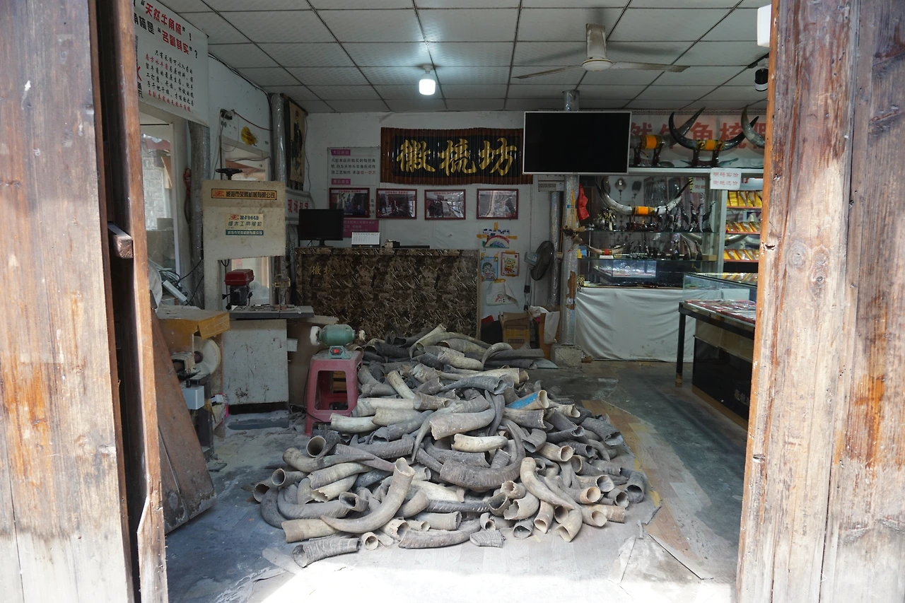 싼허구쩐에 유명한 물건은 무엇이 있냐고 하면 첫째는 깃털 부채요(제갈량이 들고 다니던 그것?!), 둘째는 소 뿔로 만든 빗(牛角梳)이라는데, 그래서 그런가 상호들 중에 먹거리를 파는 곳은 쌀이 쓰여있는 곳이 많은 반면, 소품을 파는 곳은 빗이 쓰여있거나 털이 쓰여있거나 하는 경우가 많았다. 그중에서 특히 인상적이었던 곳이 있는데, 바로 아래 사진. 소 뿔 빗을 파는 곳이었는데, 바닥에 산더미 같이 소뿔이 쌓여있었다. 빗을 실제로 구매하진 않아서 정말 이 뼈를 갈아서 빗을 만드는 것인지는 확인하지 못했지만, 혹시 관광객을 위해 보여주기 식으로 놓아둔 것은 아닌지, 약간의 의심이. 하지만 뭐, 이런들 어떠하리 저런들 어떠하리. 머릿결에 좋다고 한다, 저 빗이.