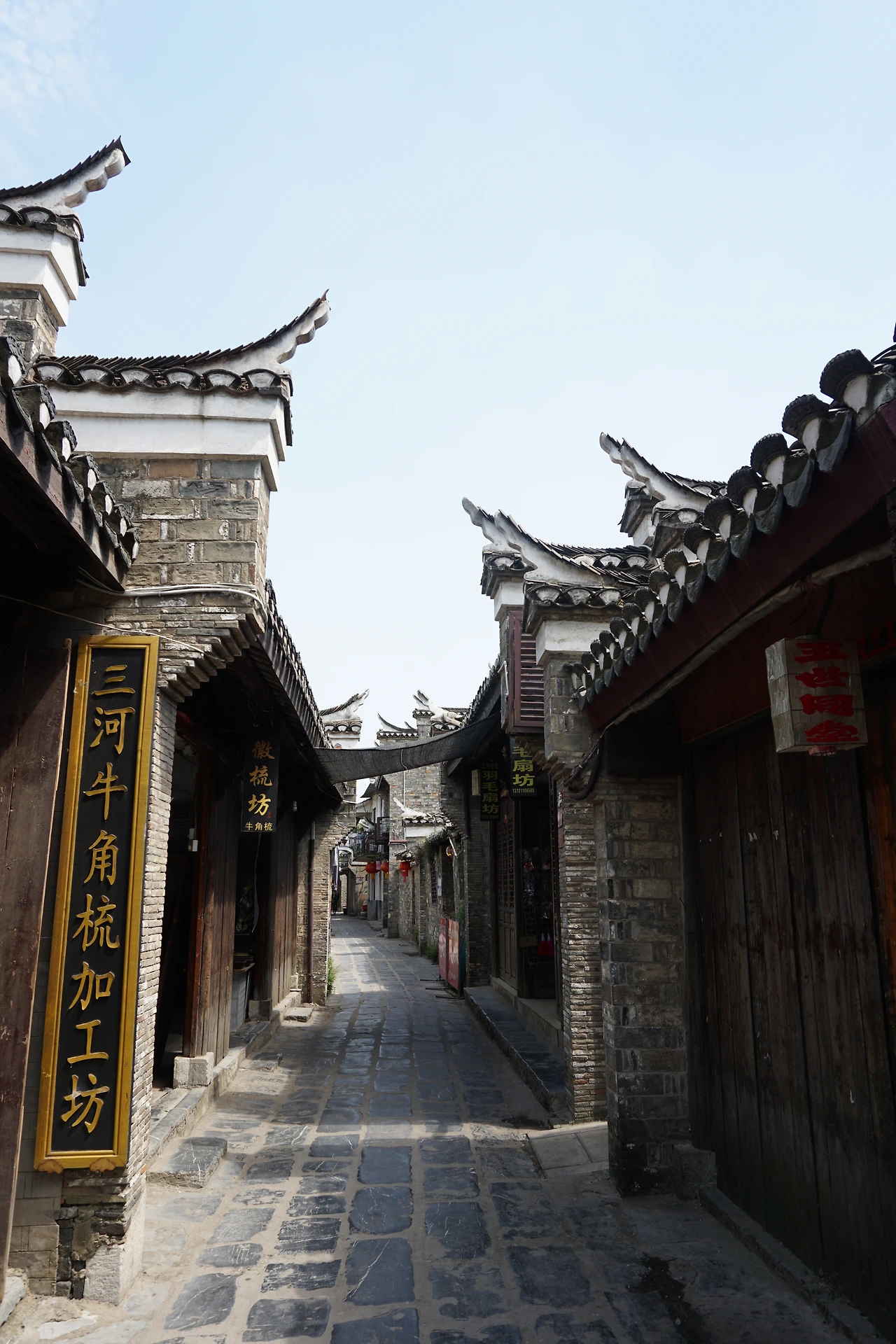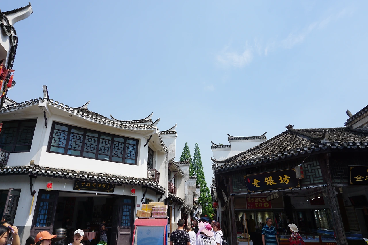 이제 대충 구쩐에서 할만한 먹거리 관련 경험은 끝난 것 같고, 거리를 좀 걸어본다. 앞서 잠시 언급했지만, 싼허구쩐에 있는 대부분의 건축물들은 모두 휘파 건축물의 특징인 마터우챵(马头墙, 마두장)을 가지고 있다. 아래 사진에서 보이는 것처럼 마터우챵은 처마가 까치의 꼬리처럼 치솟아 있는 것이 특징인데, 다닥다닥 붙어있는 건물들의 사이사이를 구분해주는 역할을 함과 동시에 옛날 마을에 화재가 발생할 경우 그 화재의 확산을 효율적으로 막는 역할도 해줬다고 한다. 지금이야 화재를 막을 수 있는 현대적인 방법이 많이 마련되어 있어 그 기능상의 의의는 많이 희미해졌지만, 그 특별한 모양이 싼허구쩐에 다른 강남 수향 마을과는 다른 매력을 선사하고 있다. (비교를 위해 주가각(周家角)의 건물들 참조)