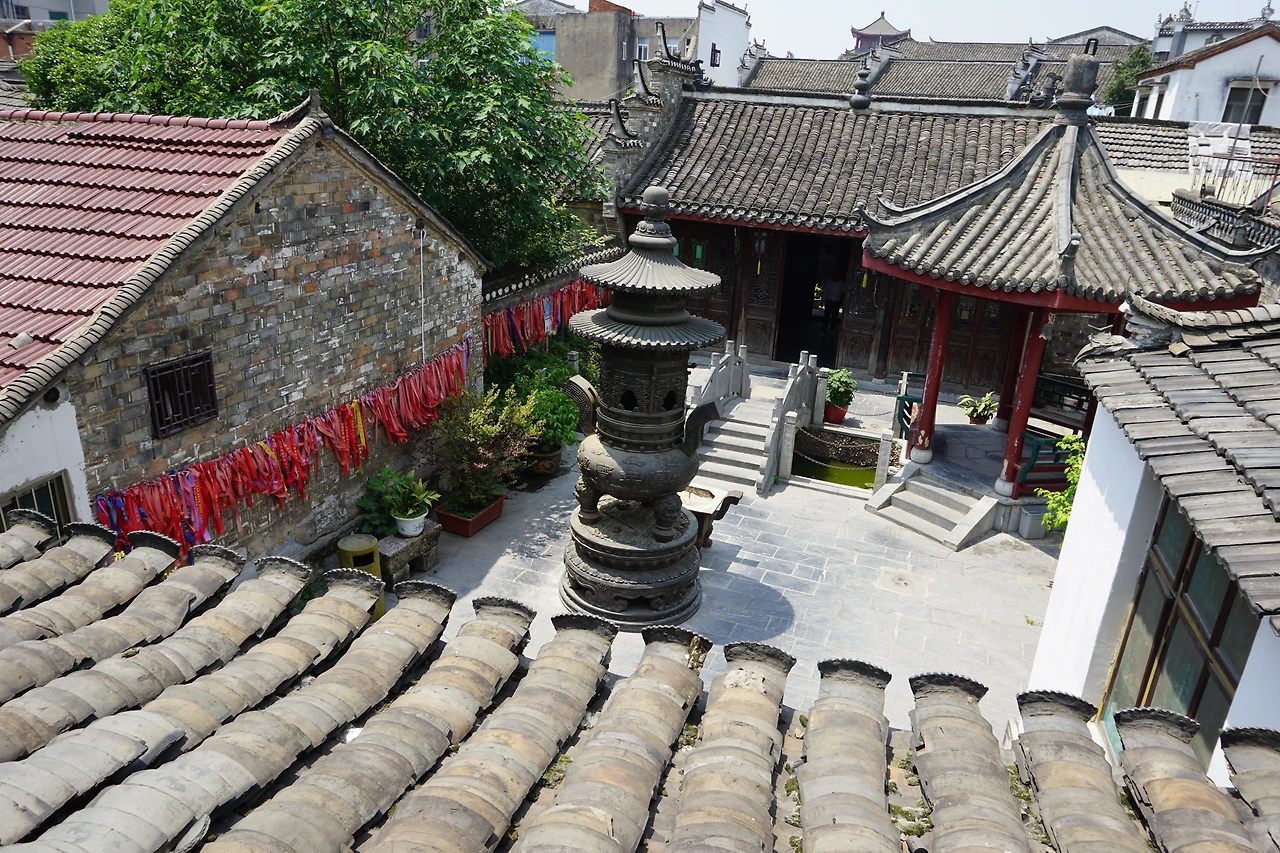 길을 따라 자연스레 걷다 보니 특이하게 생긴 건물 하나를 만나는데, 그 이름하야 씨엔구로우(仙姑楼, 선고루). 입구의 처마가 한껏 치솟은 모습이 왠지 눈에 띄어 자연스럽게 안으로 들어가 본다. 민국 시대 중허상(中和祥)이라는 기업이 사재를 털어 만든 사당이라는 이곳은 마음을 다해 빌기만 하면 자식이 생긴다는 전설이 있단다. 그래서 그런지 걸려있는 수많은 리본들 중에 유난히 "조생귀자(早生贵子, 빨리 아이를 갖게 해 달라)"라는 말이 적힌 리본이 많다.