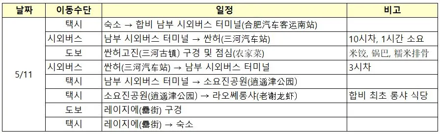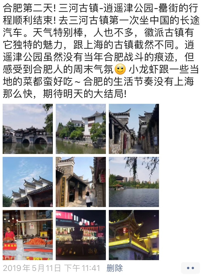 (譯) 허페이 2일차! 싼허고진 - 소요진공원 - 레이지에로의 일정이 모두 잘 끝났다. 싼허고진에 가면서 처음으로 중국의 시외버스를 타봤다. 날씨도 너무 좋았고, 사람도 별로 없었고, 후이파이(徽派) 고진은 그것만의 매력이 있었다. 상하이의 옛 마을과는 확실히 달랐다. 소요진 공원은 비록 예전 합비전투의 흔적은 없지만, 허페이 사람들의 주말 분위기를 느끼기엔 충분했다. 샤오롱샤와 현지 요리들 모두 맛있었고.. 허페이의 생활 리듬은 상하이의 그것만큼 빠르지 않은 것 같다. 내일의 최종회가 기대된다!