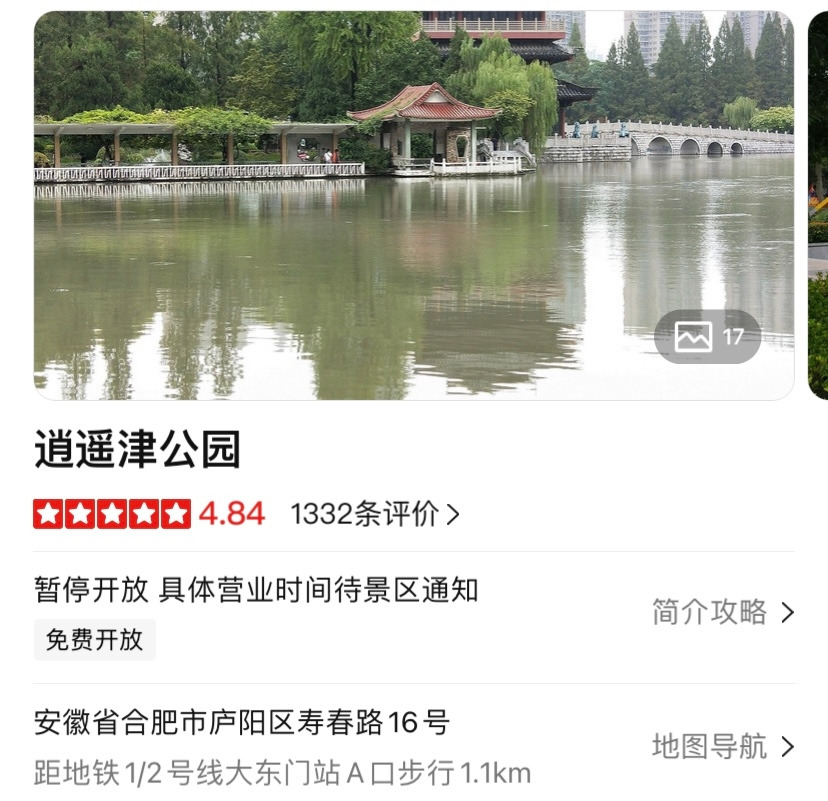 입구에 청 광서제 때의 장원 루룬샹(陆润庠) 친필의 고소요진(故逍遥津)이라는 글자가 적혀있는 이 공원은 사실 합비 전투 때에는 그저 나루터였고, 이후에는 돈 많은 사람들의 사유지였다가 신중국 성립 이후에나 공원으로 조성되었다고 한다. 2007년부터는 무료 개방을 하고 있는데, 찾아보니 현재는 내부 공사 등으로 폐쇄된 상태라고 한다. 어째 코로나 발생을 기점으로 이런 공원들이 많이 폐쇄된 느낌이다.