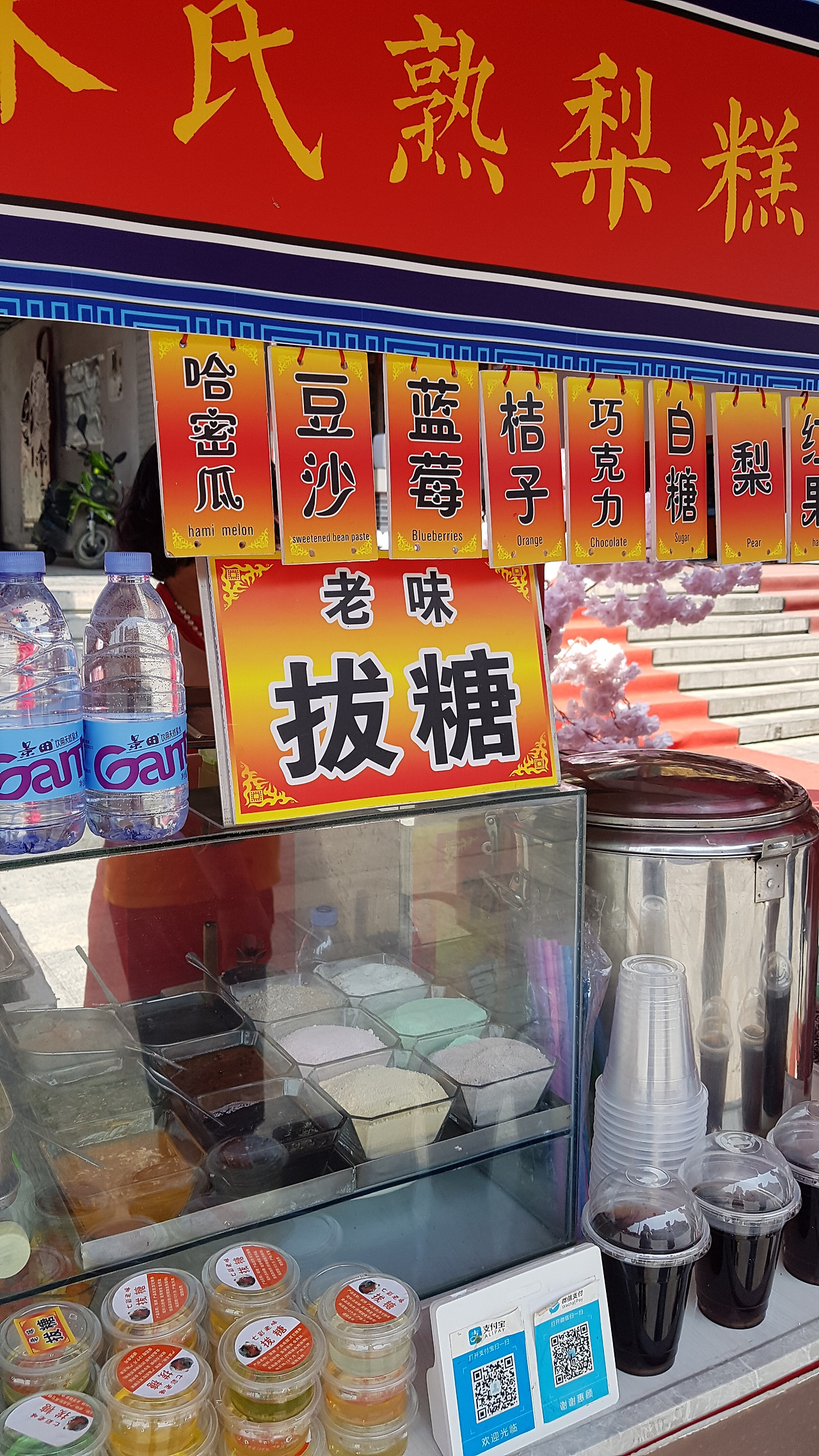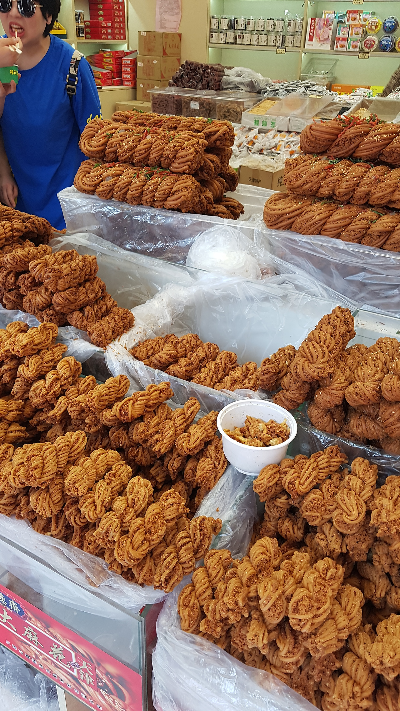 세 번째 사진은 바로 전편에서 언급했던 톈진의 전통 간식, 마화(麻花)다. 조그만 꽈배기 과자 정도를 생각했던 나는 저 어린 아이 팔뚝만한 과자에 기겁을 했다. 자세히 보면 맛도 다르고 심지어 시식할 수 있게도 만들어놨는데, 도저히 살 엄두는 나질 않았다.
