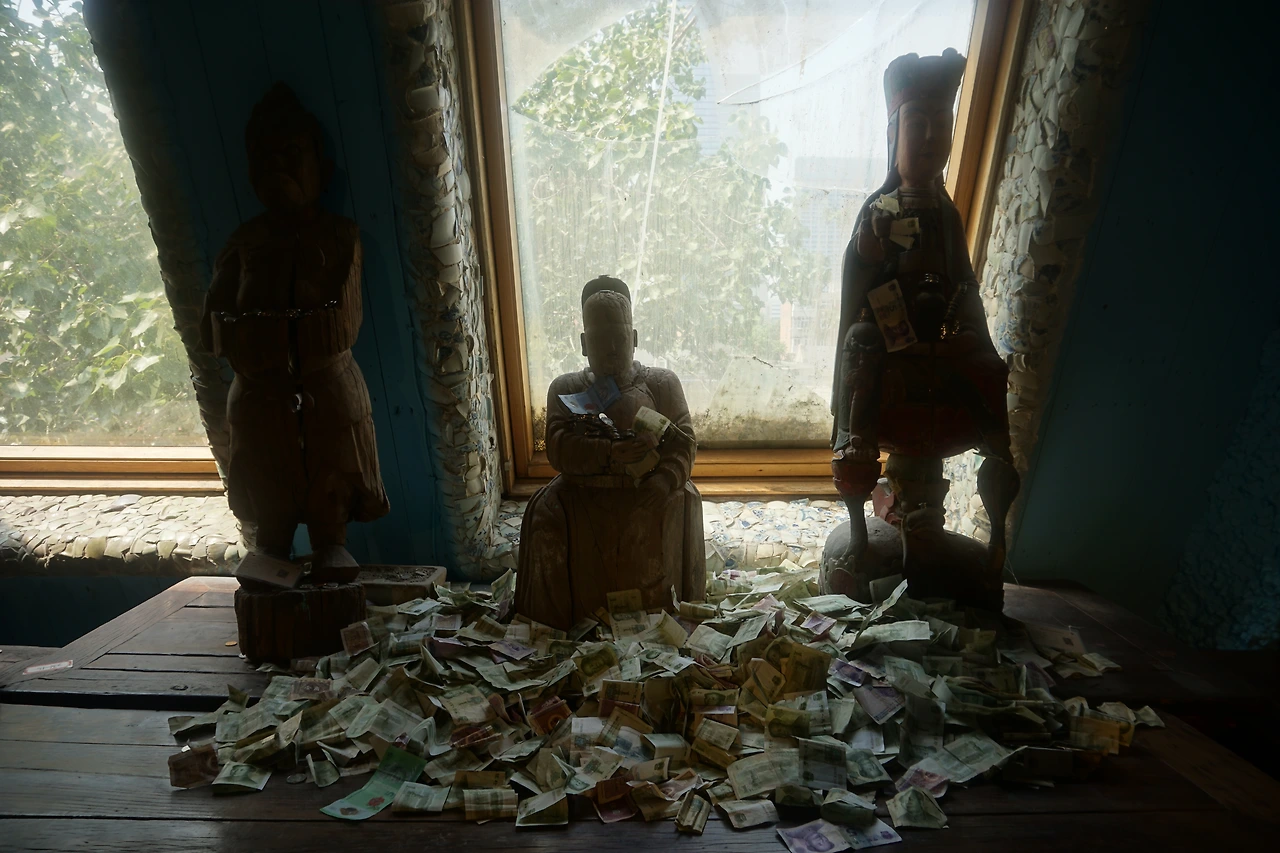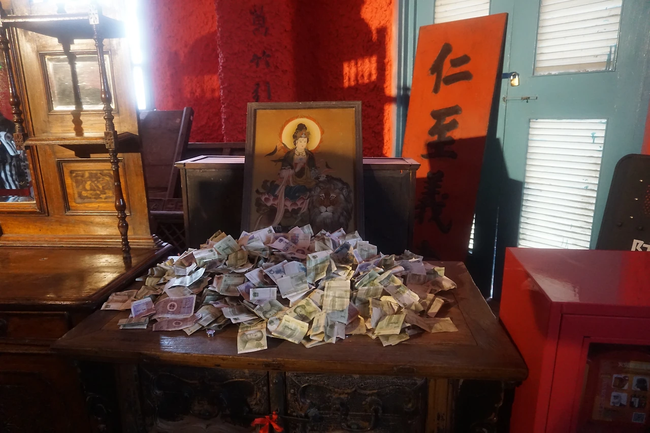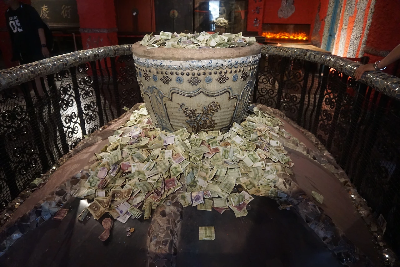 골동 조각상이나 위패가 모셔진 곳, 이름 모르는 보살의 그림이 놓여진 곳에 놓인 돈은 그럴 수도 있겠다 싶은데 계단 옆에 돌로 음각된 조각, 그리고 아무것도 들어있지 않은 도자기 항아리 안에도 돈이 가득 차 있다. 아무리 1위안 이하의 작은 돈만 있다고 해도 티끌 모아 태산인데, 개중에는 심지어 5위안 이상의 지폐도 보였다. 참 중국인이 해학적인 것이, 어떤 조각상에는 손 부분에 억지로 지폐를 쥐어준 경우도 있었다. 팔짱을 낀 것 같은 조각상에는 그 품에 지폐를 안겨주었다. 어떻게든 내 지폐를 받고 내게 복을 달라는, 중국인의 현세구복적인 마음이 담겨 있다.