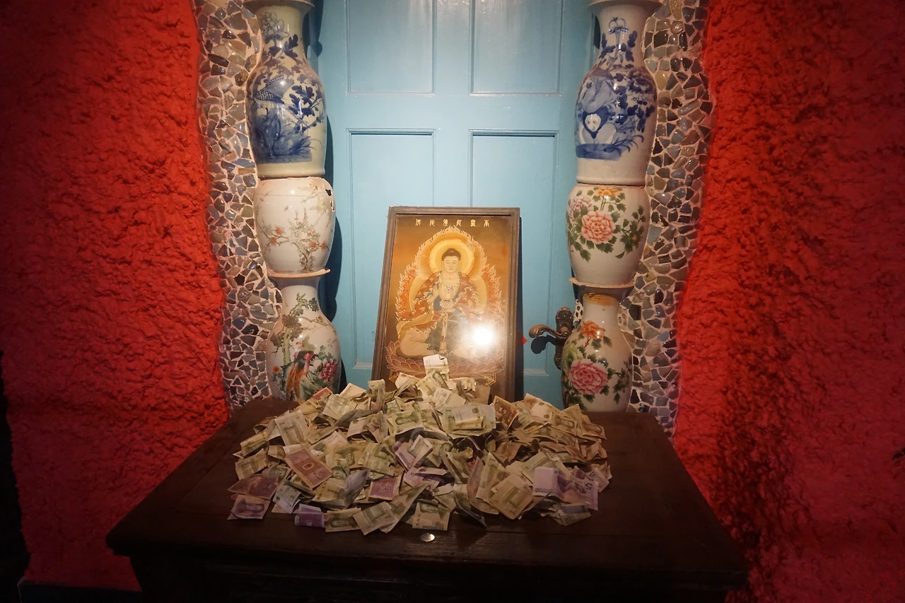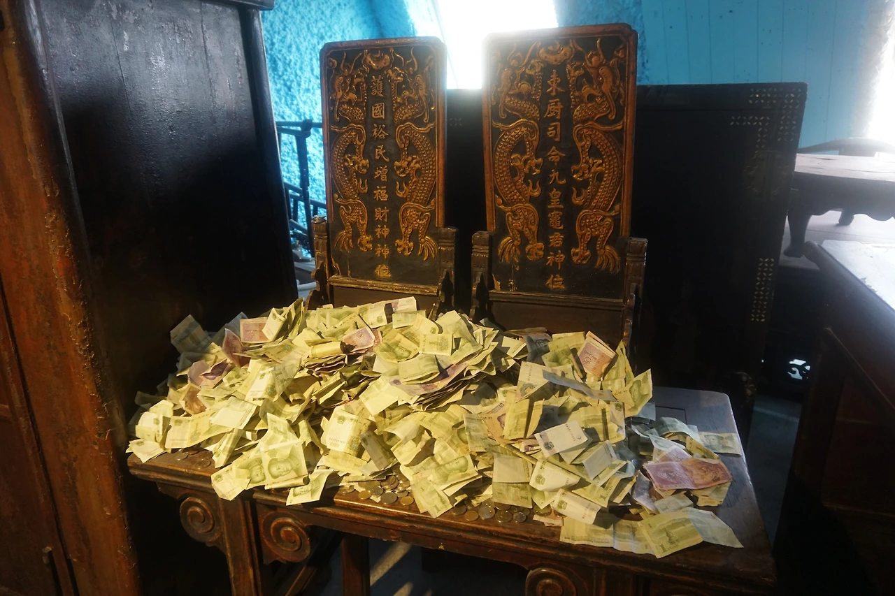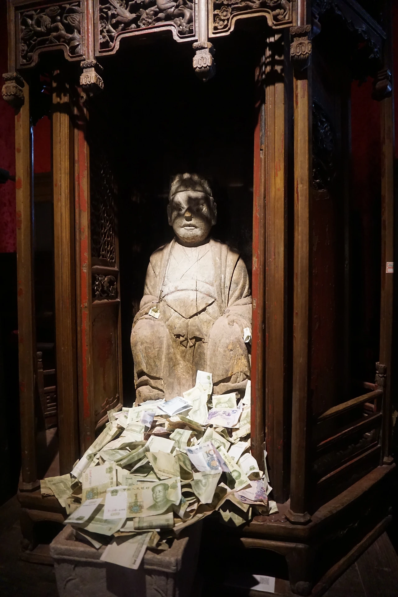 골동 조각상이나 위패가 모셔진 곳, 이름 모르는 보살의 그림이 놓여진 곳에 놓인 돈은 그럴 수도 있겠다 싶은데 계단 옆에 돌로 음각된 조각, 그리고 아무것도 들어있지 않은 도자기 항아리 안에도 돈이 가득 차 있다. 아무리 1위안 이하의 작은 돈만 있다고 해도 티끌 모아 태산인데, 개중에는 심지어 5위안 이상의 지폐도 보였다. 참 중국인이 해학적인 것이, 어떤 조각상에는 손 부분에 억지로 지폐를 쥐어준 경우도 있었다. 팔짱을 낀 것 같은 조각상에는 그 품에 지폐를 안겨주었다. 어떻게든 내 지폐를 받고 내게 복을 달라는, 중국인의 현세구복적인 마음이 담겨 있다.