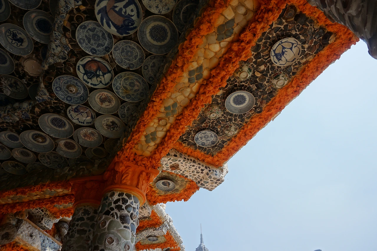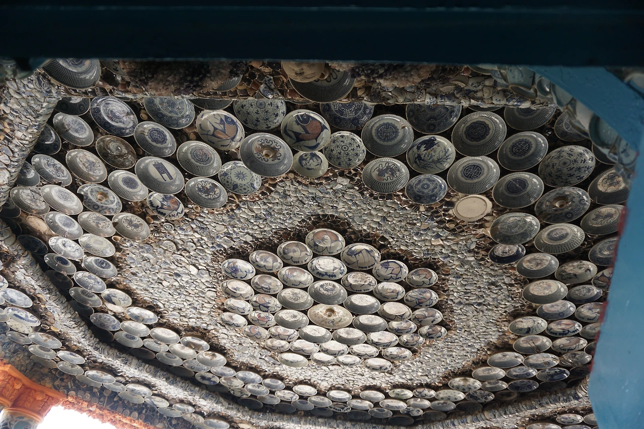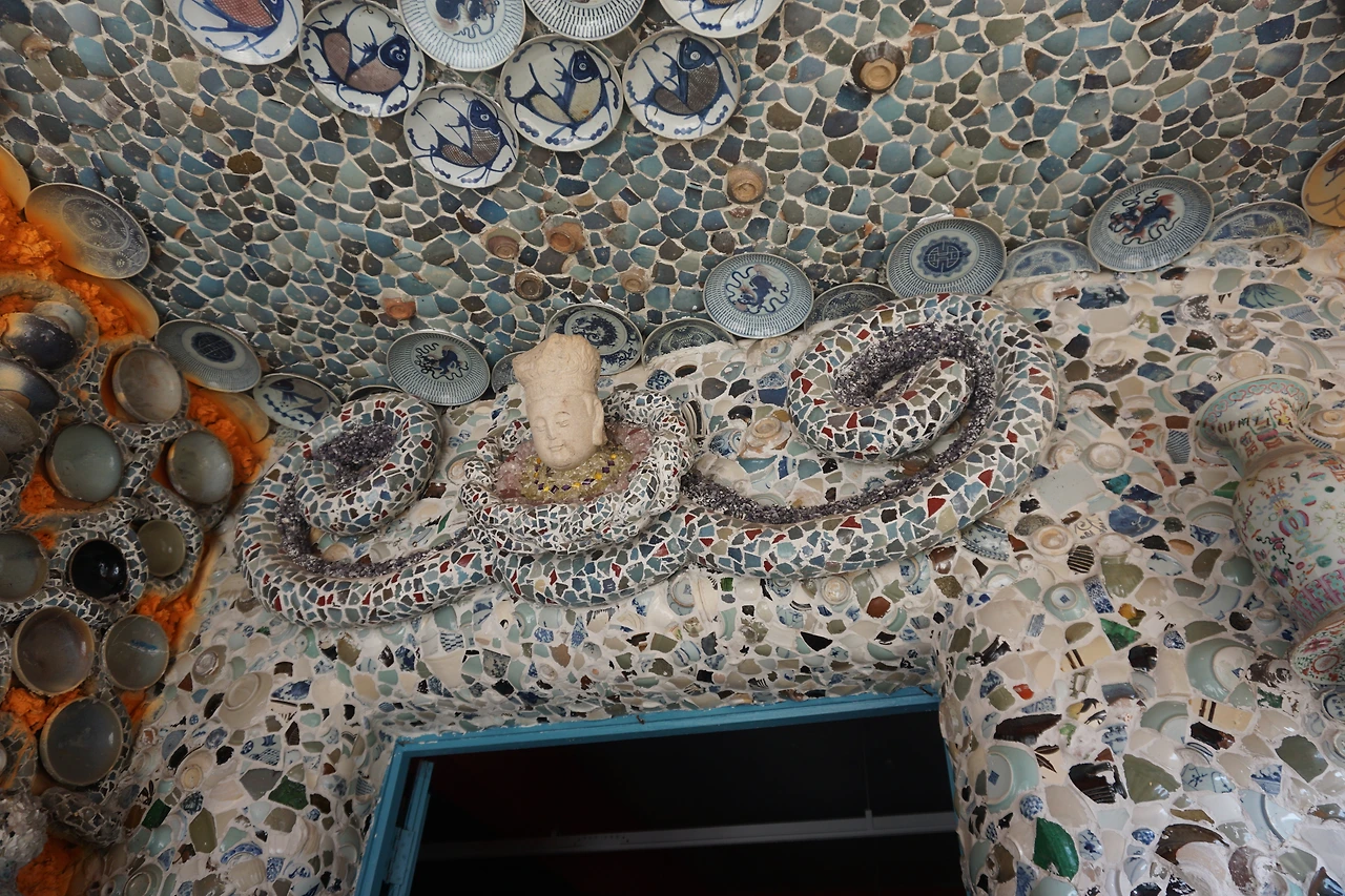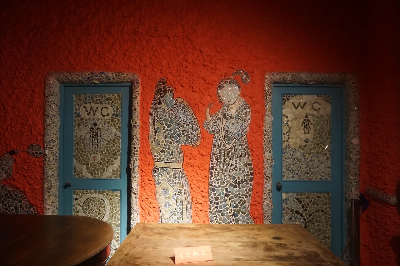 안으로 들어가면 주황색으로 오톨도톨하게 발라진 벽면에 각종 도자기 파편 및 자기 접시나 그릇으로 꾸며진 실내가 나온다. 특히 벽면에 도자기로 만들어 놓은 회화 작품에는 어느 시기의 어떤 작품인지도 적혀있다. 천장을 수놓은 그릇들은 그 무늬와 모양이 모두 달라 이곳을 만든 사람이 얼마나 다양한 자기들을 소장하고 있었는지 알 수 있다. 조명갓도 도자기로 되어있고, 심지어 화장실까지 도자기 파편으로 장식해둔 것을 보고 깜짝 놀랐다.