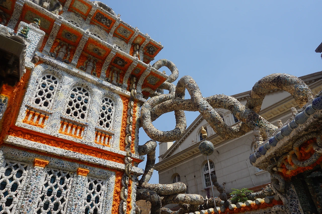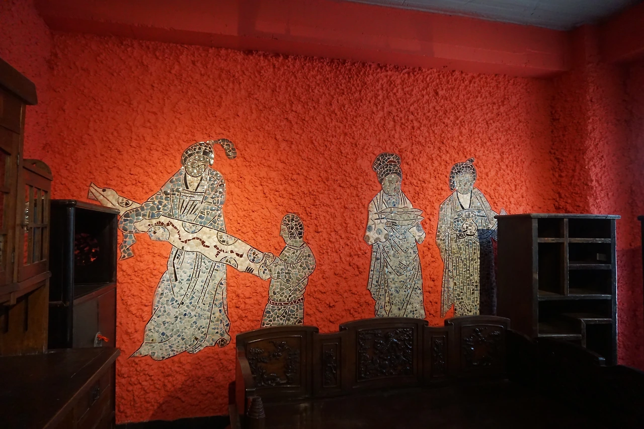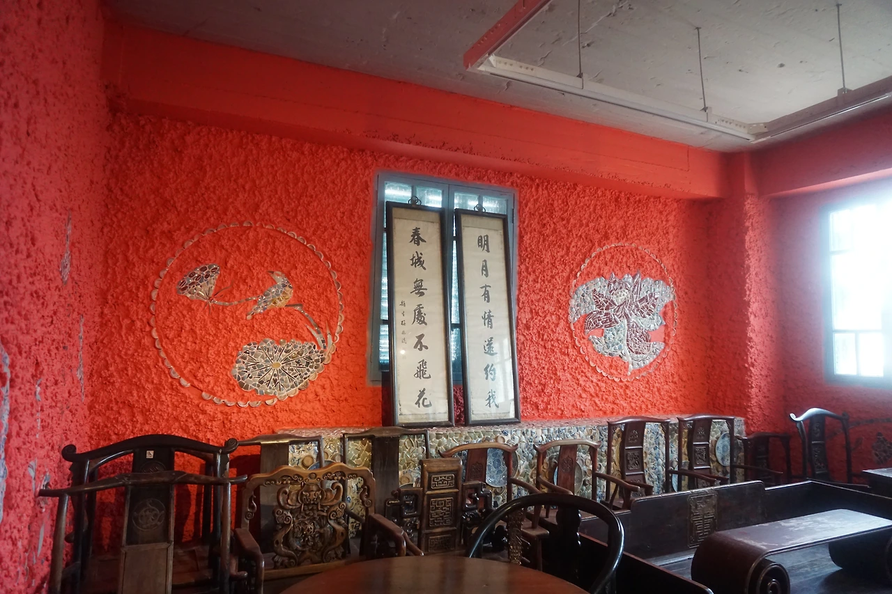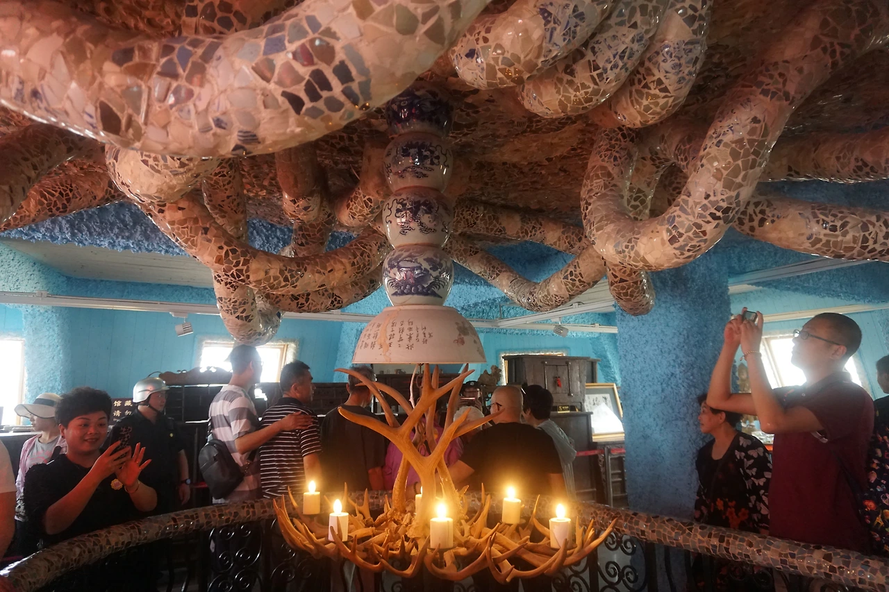 안으로 들어가면 주황색으로 오톨도톨하게 발라진 벽면에 각종 도자기 파편 및 자기 접시나 그릇으로 꾸며진 실내가 나온다. 특히 벽면에 도자기로 만들어 놓은 회화 작품에는 어느 시기의 어떤 작품인지도 적혀있다. 천장을 수놓은 그릇들은 그 무늬와 모양이 모두 달라 이곳을 만든 사람이 얼마나 다양한 자기들을 소장하고 있었는지 알 수 있다. 조명갓도 도자기로 되어있고, 심지어 화장실까지 도자기 파편으로 장식해둔 것을 보고 깜짝 놀랐다.