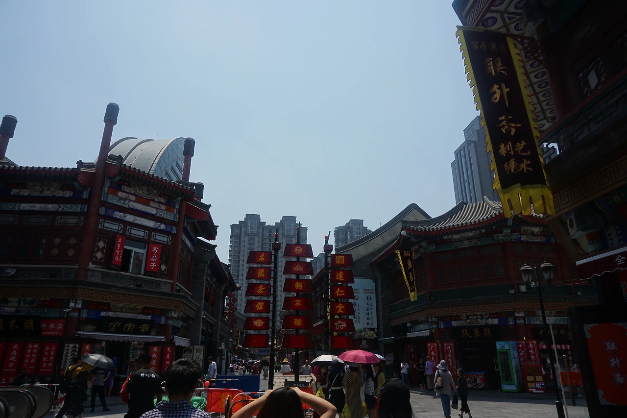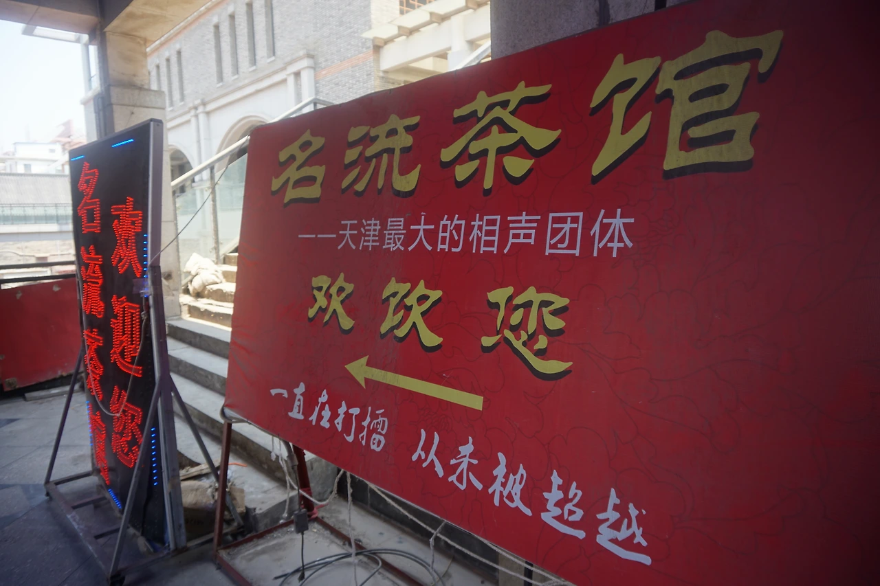 길 한복판에 이정표처럼 세 곳의 이름이 적혀있는데, 아무래도 이 고문화 거리, 나아가서는 톈진을 대표하는 곳이 적혀있는 것 같은 느낌이다. 가운데에는 톈진을 대표하는 빠오즈 가게 '거우부리빠오즈(狗不理包子)'가 적혀있고, 오른편에는 톈진에서 시작한 오래된 약방, 다런탕(达仁堂)이 적혀있다. 왼쪽에 적힌 '밍러우차관(名楼茶馆)'은 무엇인가 봤더니, 이곳에서 유명한 찻집이다. 찻집이라고 해서 그냥 앉아서 차 마시는 분위기는 아니고, 우리로 치면 만담 같은 상성(相声) 공연을 보면서 차를 마시는 곳이다. 상하이·쑤저우에서는 찻집이라 하면 평탄(评弹)을 들으며 차를 마실 것 같은데, 과연 북방은 다르다.