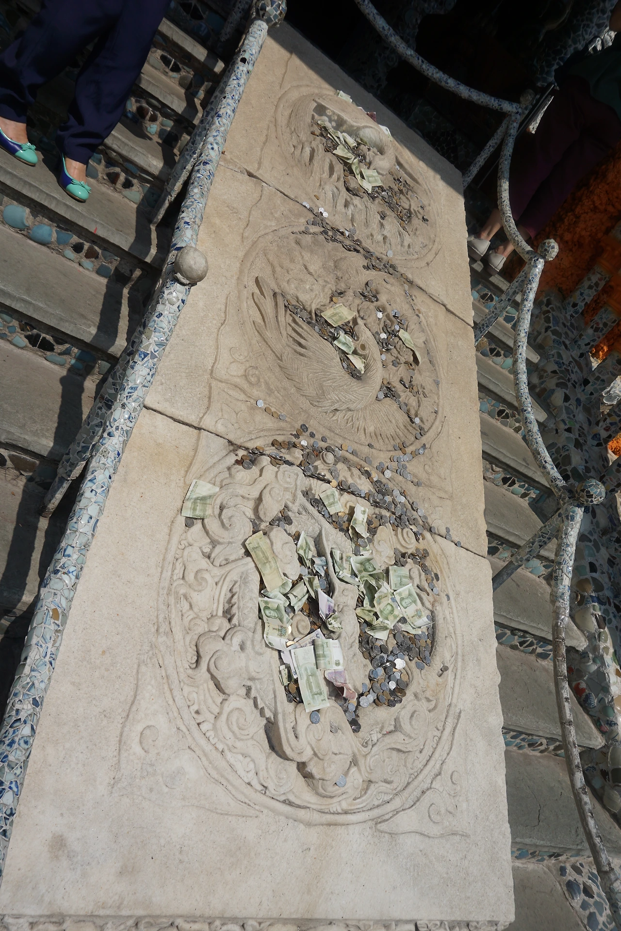 그러나 뭐니뭐니해도 이곳에서 본 것 중에 가장 인상 깊었던 것은 컬러풀한 도자기 파편들이 아니라 컬러풀한 지폐의 향연이었다. 일전에 난징 푸즈먀오(夫子庙)나 허페이의 싼허구쩐(三河古镇)에 대한 글에서도 언급한 바 있지만, 중국의 관광지에 연못과 같은 곳이 있으면 꼭 돈을 넣는 사람이 있다. 재밌는 것은 이곳엔 연못도 없는데도 돈을 놓는 사람들이 있었다는 것이다.