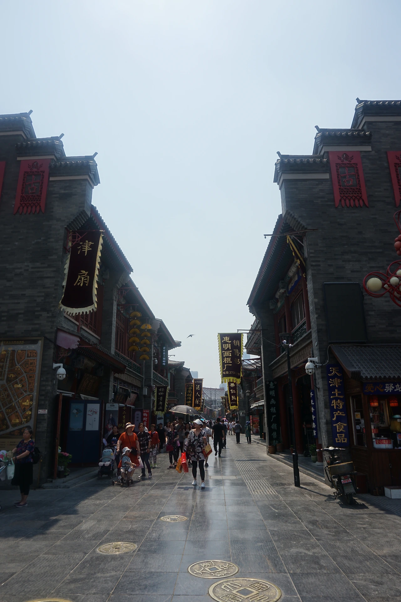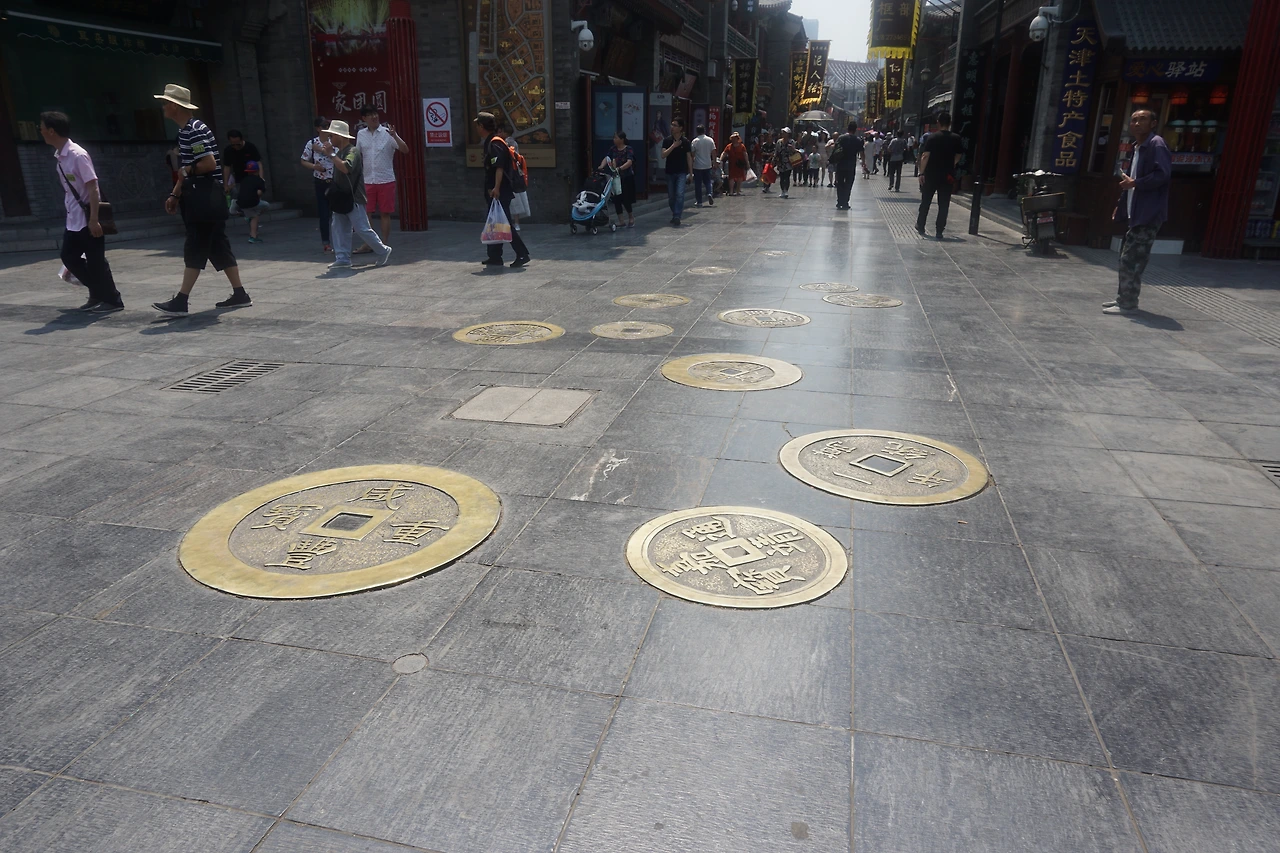 고풍스럽게 만들어진 문을 따라 고문화거리로 접어들면, 위 사진처럼 옛 동전들이 깔린 돌바닥이 나온다. 돌로 된 바닥과 양쪽을 수놓은 청나라 느낌의 건물들이 재미있다. 게다가 이 모든 것이 톈진 시내에 있다는 것도 재미있다.