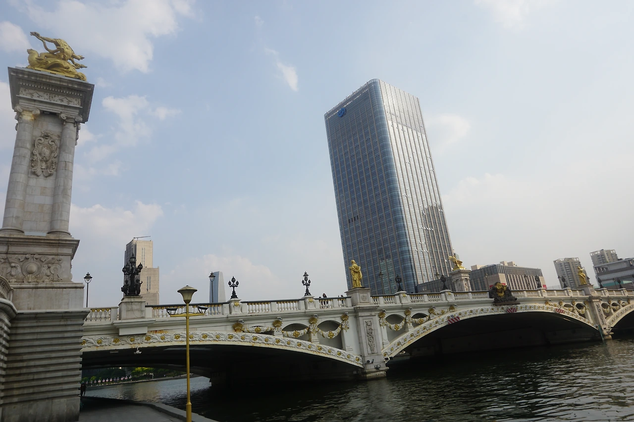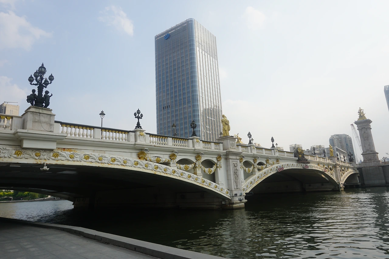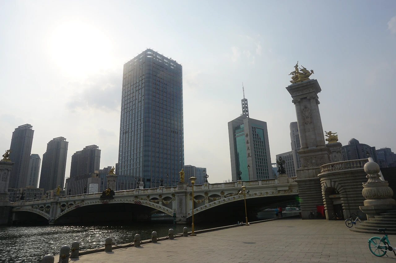 강변을 따라 조성된 하이허 중심광장공원(海河中心广场公园)을 지나면 꽤나 고풍스러운 다리를 하나 만나게 되는데, 멀리 이통빌딩(移通大厦)가 보이는 이곳은 베이안챠오(北安桥)다. 이곳 하이허에는 유럽 언젠가의 디자인을 한 다리가 꽤 많이 있는데, 이 다리도 그중 하나다. 베이안챠오는 본래 1937년에 이곳에 만들어진 다리라는데, 본래는 나무로 된 다리였고 이후 두 번에 걸쳐 개조하면서 지금의 모습을 갖추었다고 한다. 다리 위에는 서로 다른 전통 악기를 든 4명의 여인 동상이 서있다. 서양식의 디자인에 동양의 여인을 둔 것이 특이하다.