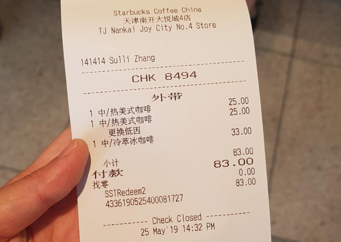 그러고 보니 중국에서 스타벅스를 자주 이용하면서 항상 참 부러웠던 것이 있다. 디카페인을 주문했을 때 추가 비용이 들지 않는다는 점이다. 위 영수증을 보면 아메리카노를 디카페인(低因)으로 바꿨는데도 추가 비용 없이 결제가 되었다. 한국에서라면 발생하는 추가 비용인데, 중국에서는 어디서도 추가 비용을 받지 않았다. 차를 많이 마시고 커피의 카페인을 좋아하지 않는 중국인이 많아서일까? 그 이유는 정확하게 알 수 없지만, 위가 좋지 않아 일반 커피를 많이 마시면 무리가 오는 나의 경우에는 중국의 그런 정책이 참 부러웠다. 9월 한국으로 잠깐 중간 귀국했을 때 스타벅스에서 무심코 디카페인으로 변경했다가 추가 비용이 찍힌 것을 보고 조금 억울한 기분이 들었던 것도 사실이다.